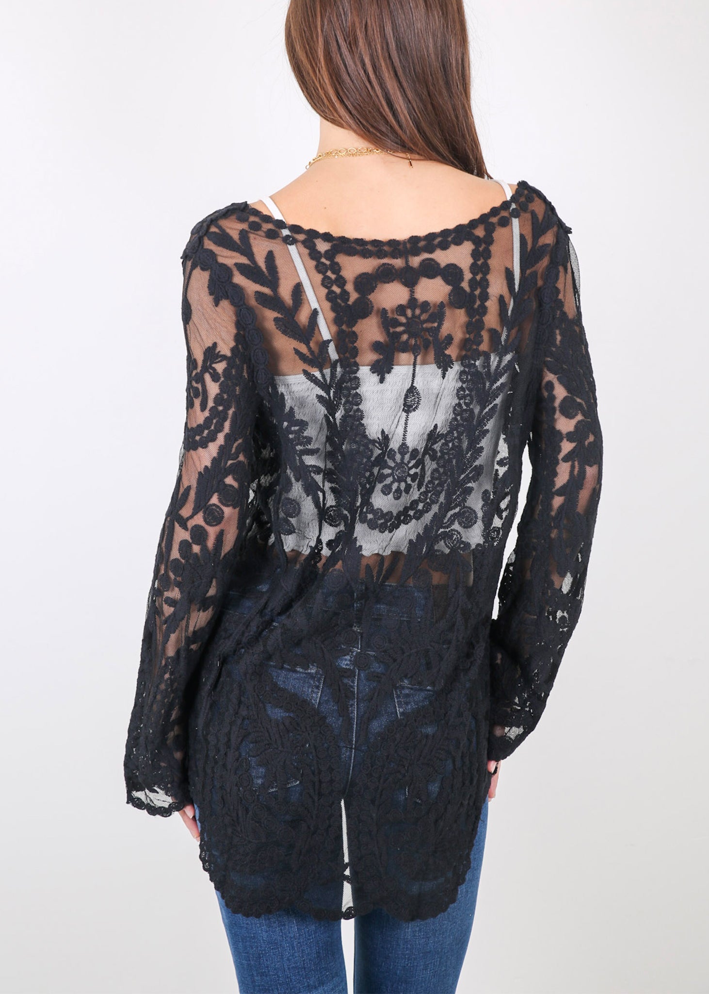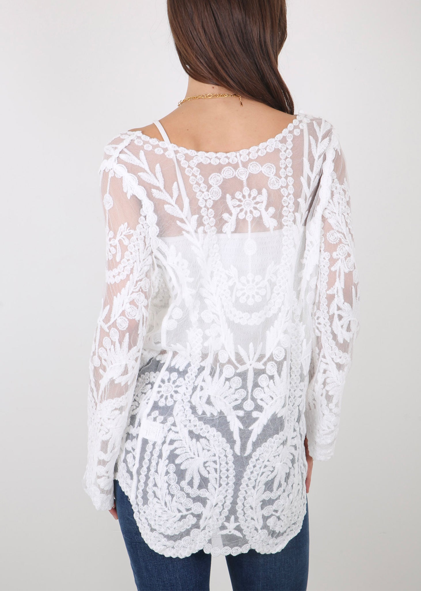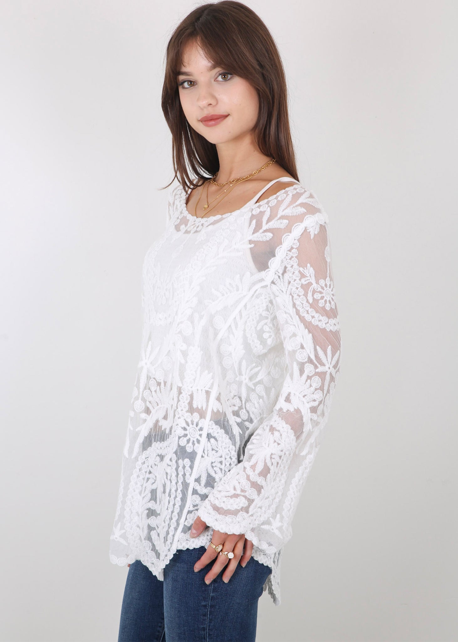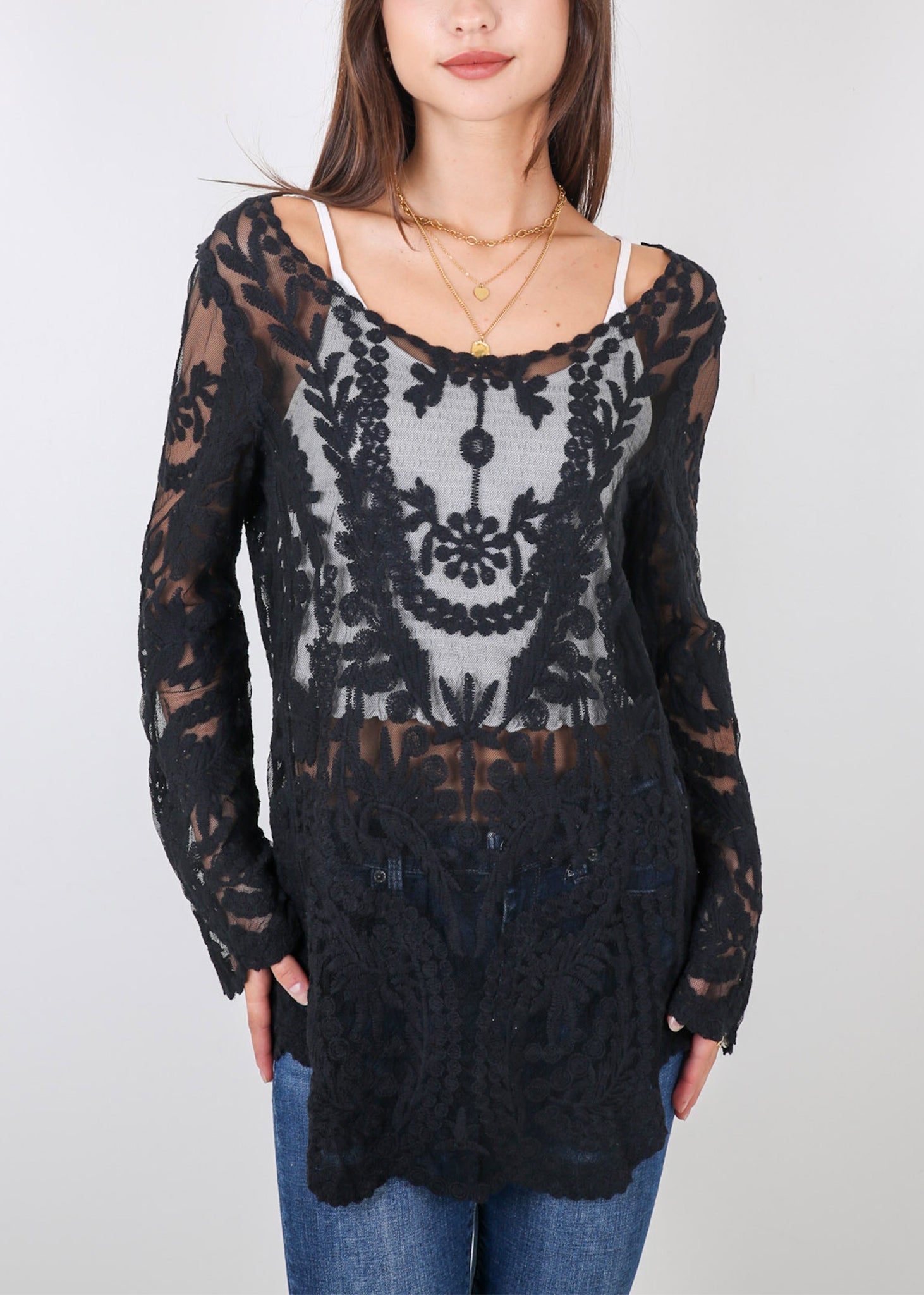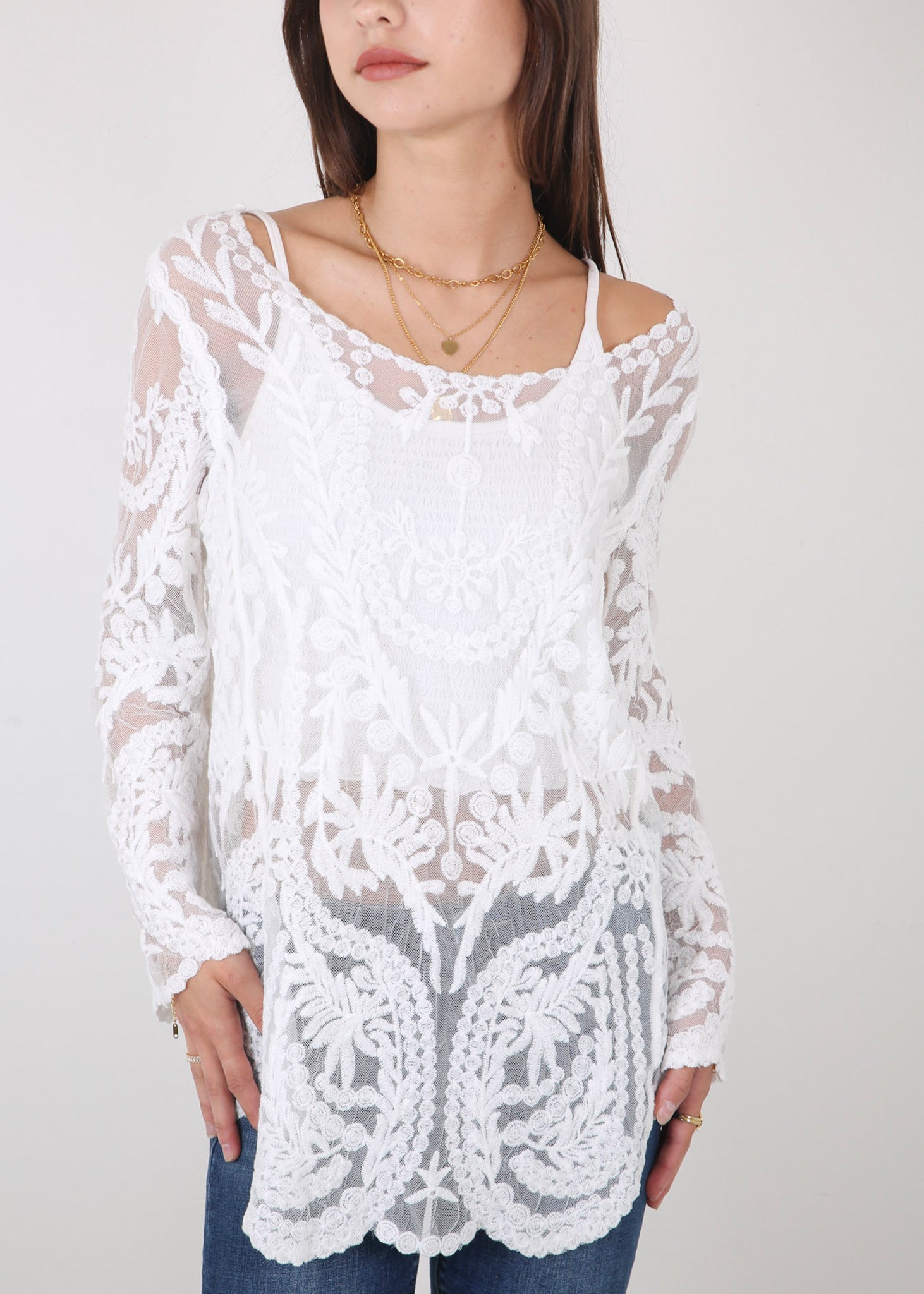 MATERIAL. Made of soft breathable and lightweight fabric, very comfortable, slight stretch. FEATURE. Crochet, contrast lace plunging cover-up, hollow out, v neck, 3/4 sleeve, mesh, mini length, See Through, embroidered romantic leafy floral design, hem flowy babydoll beach dress.