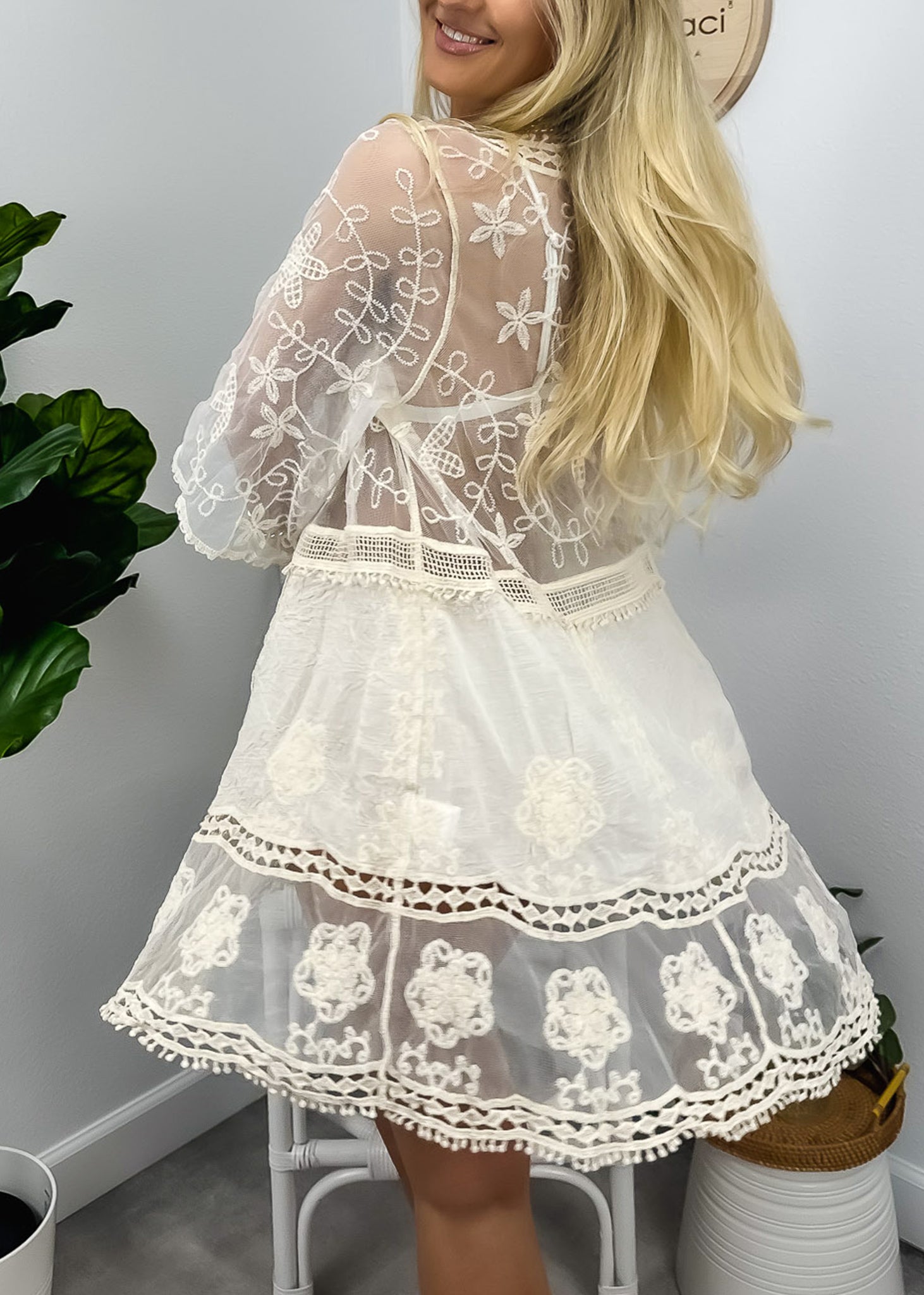 Contrast Embroidered Lace V Neck Bikini Cover Up Beach Mini Dress with Half Sleeve - White