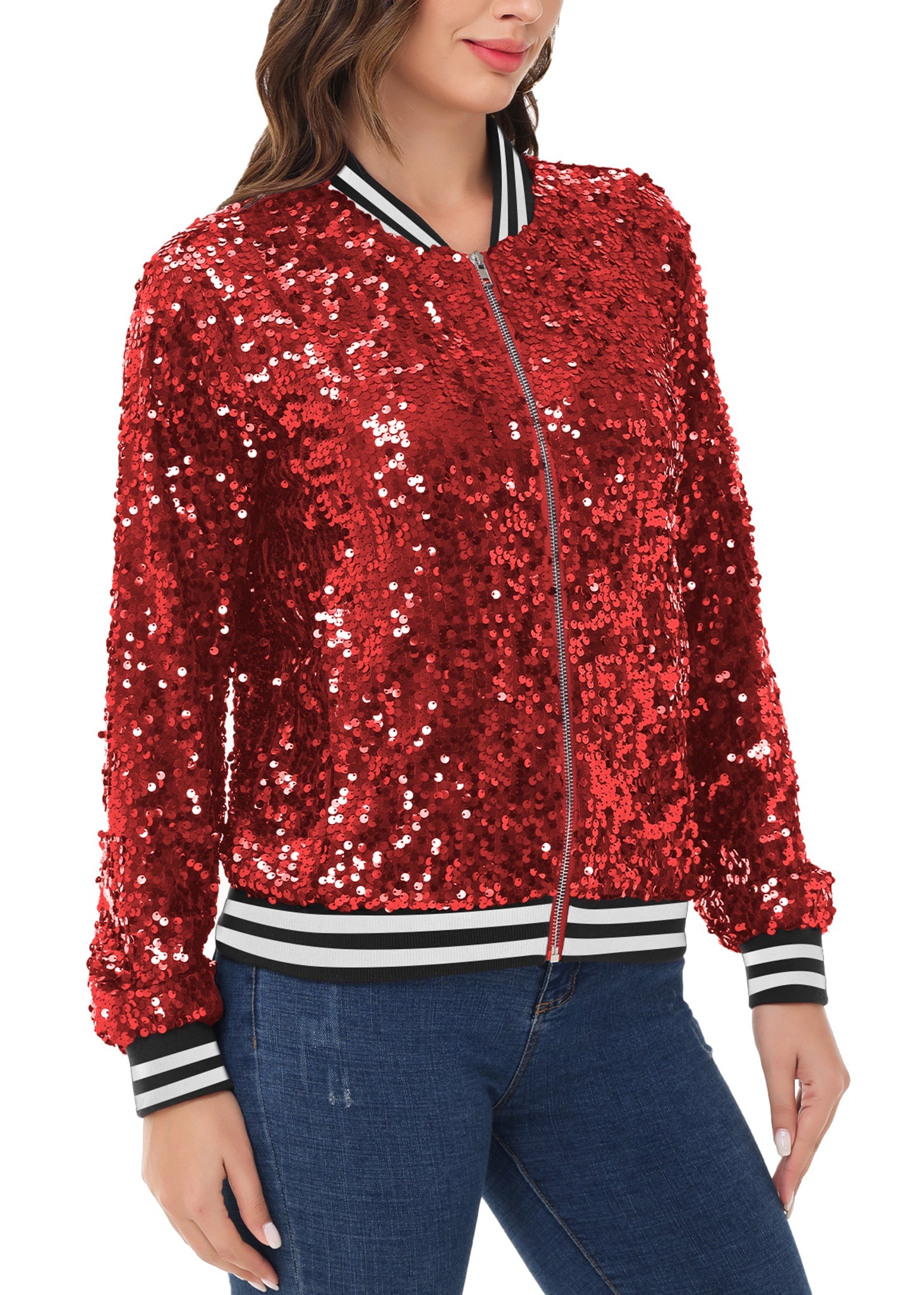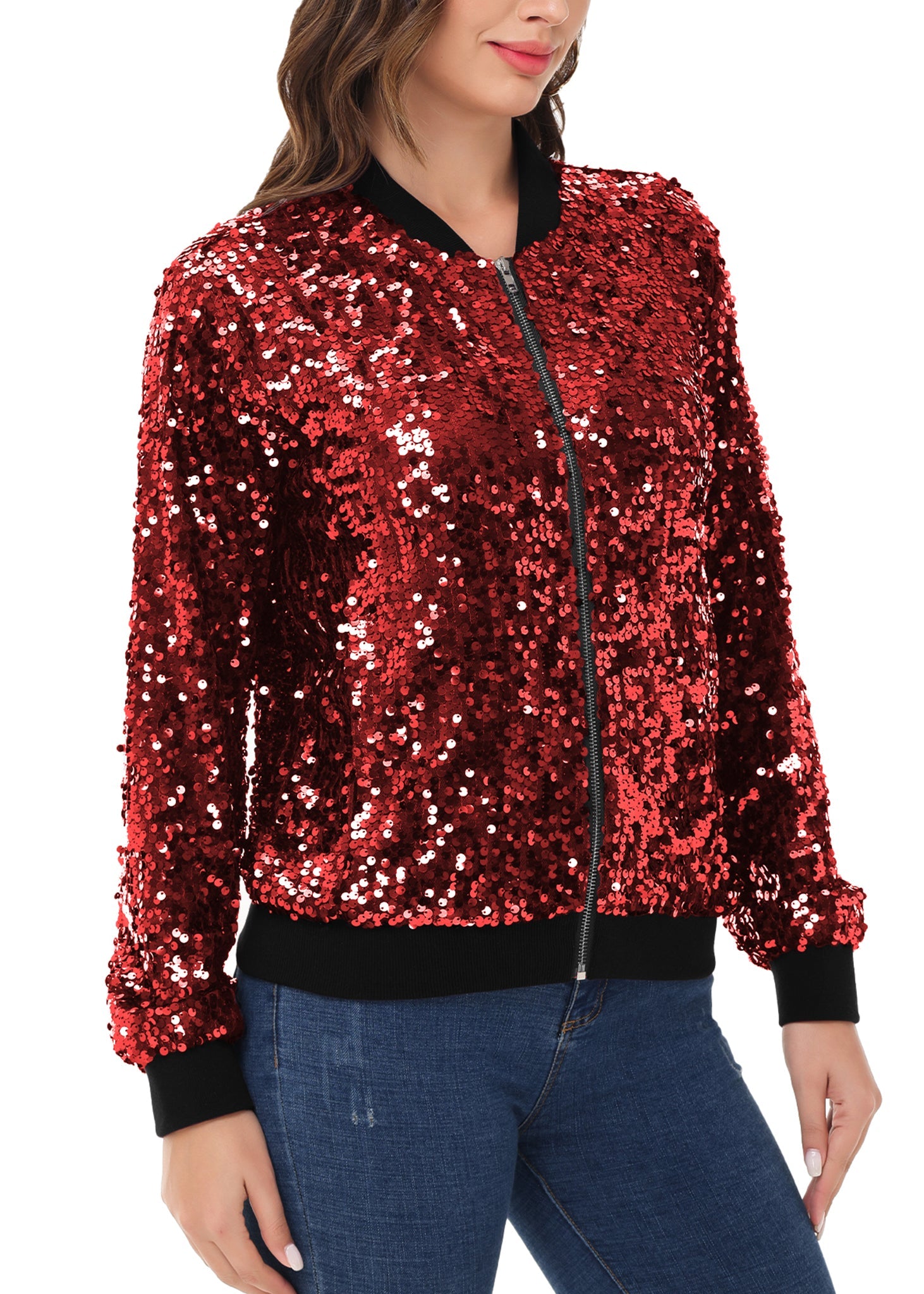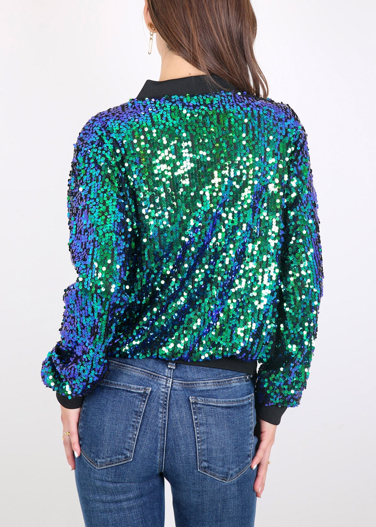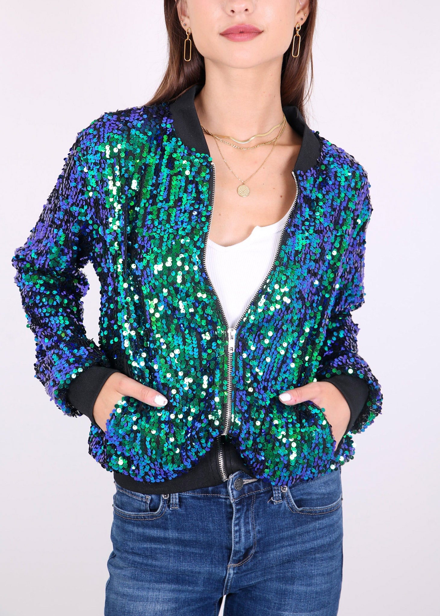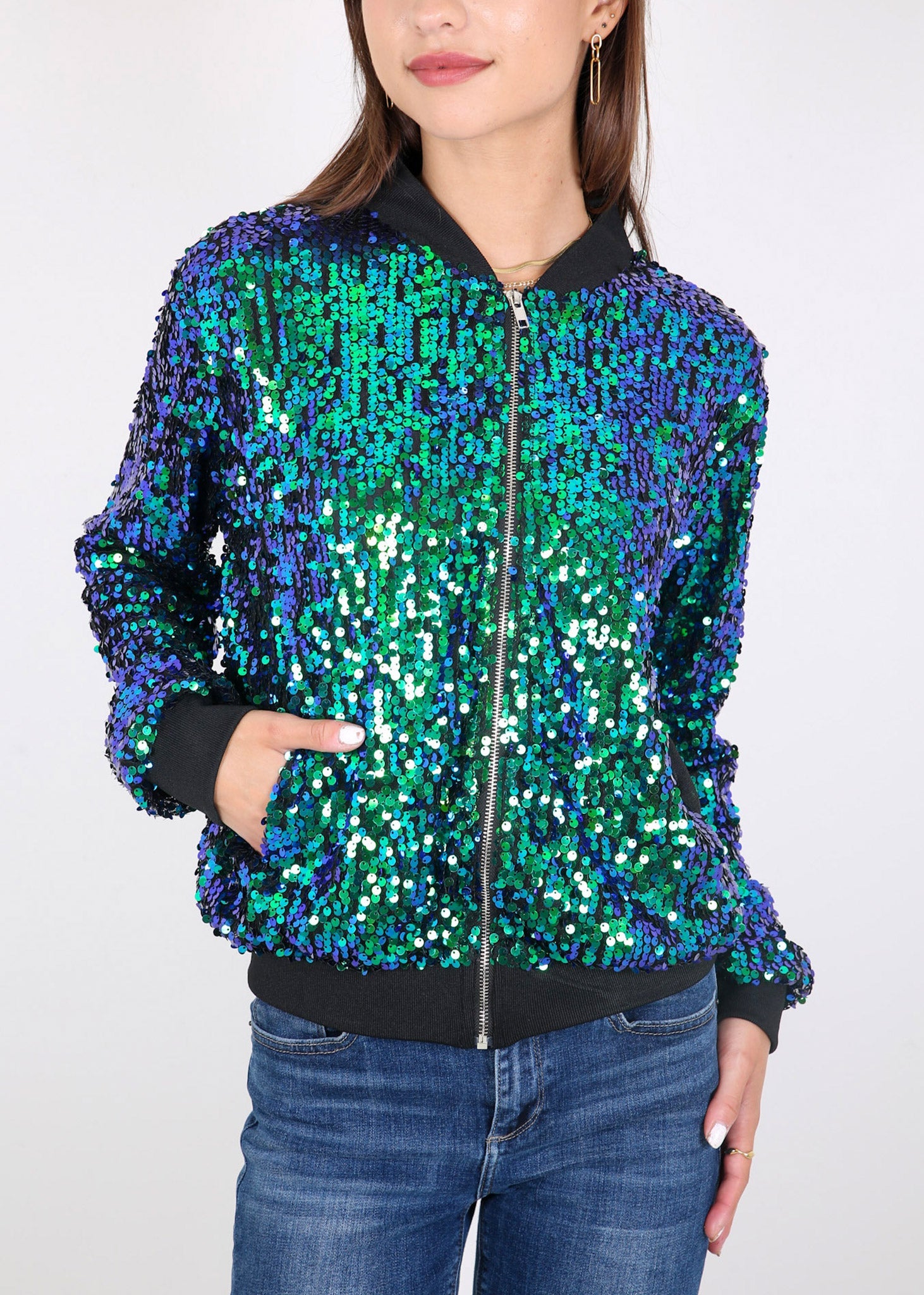 Featuring a shiny sequin zip bomber jacket with long sleeves, a v-neck, and front zipper closure.