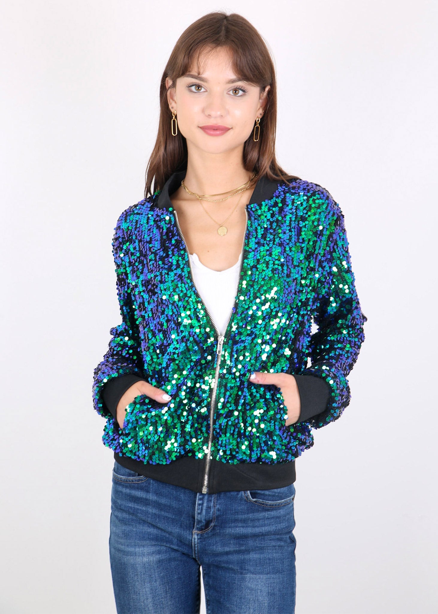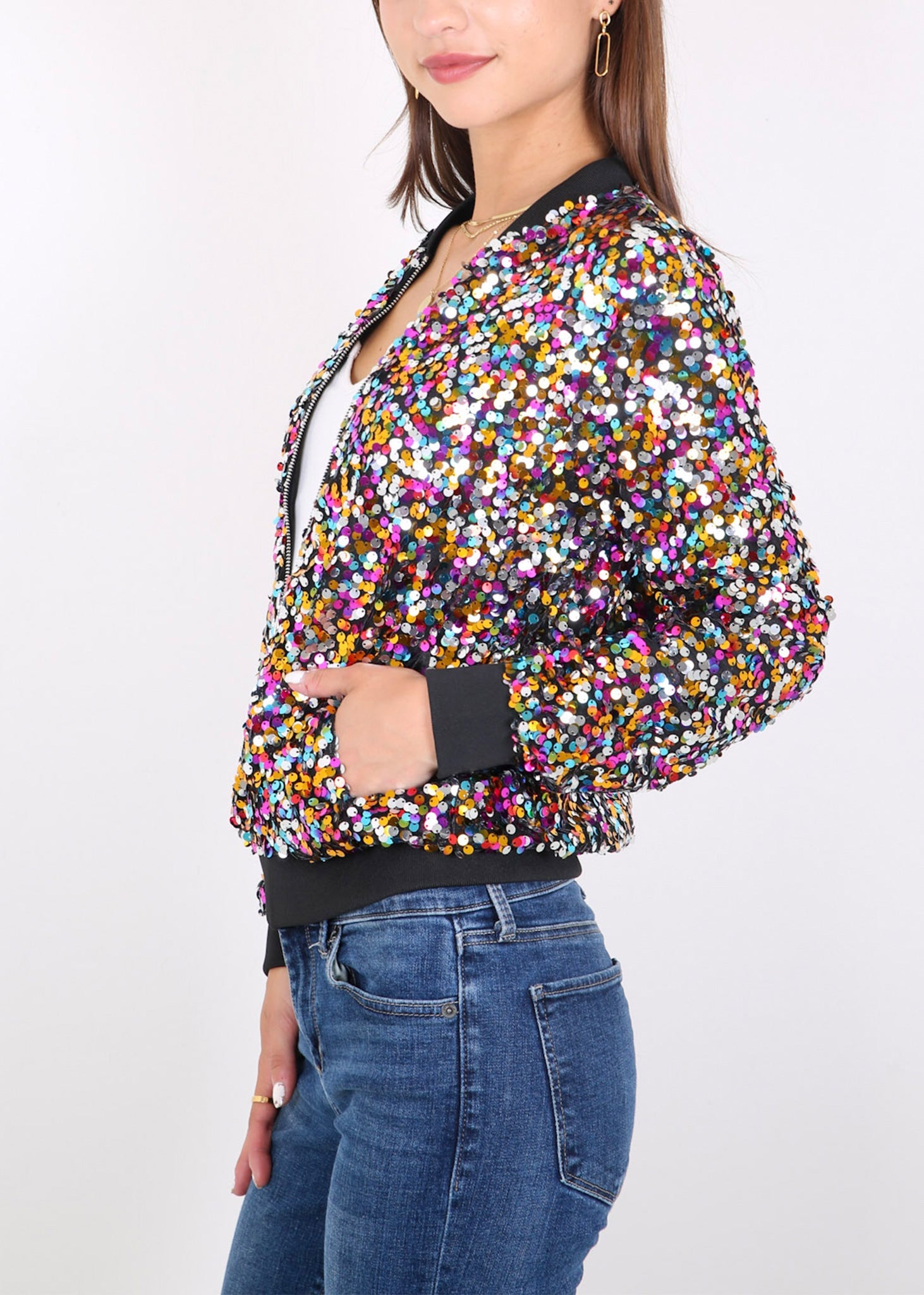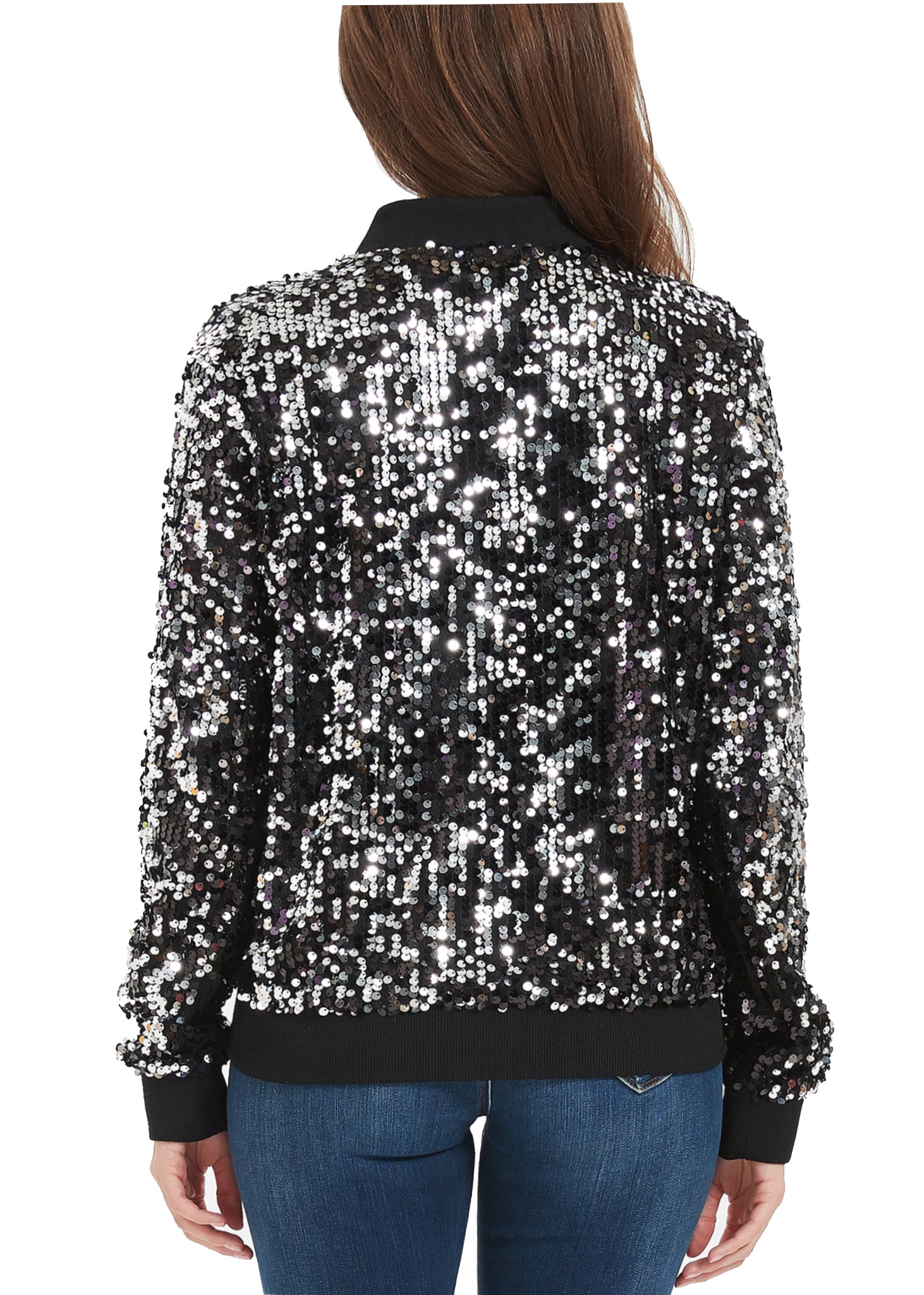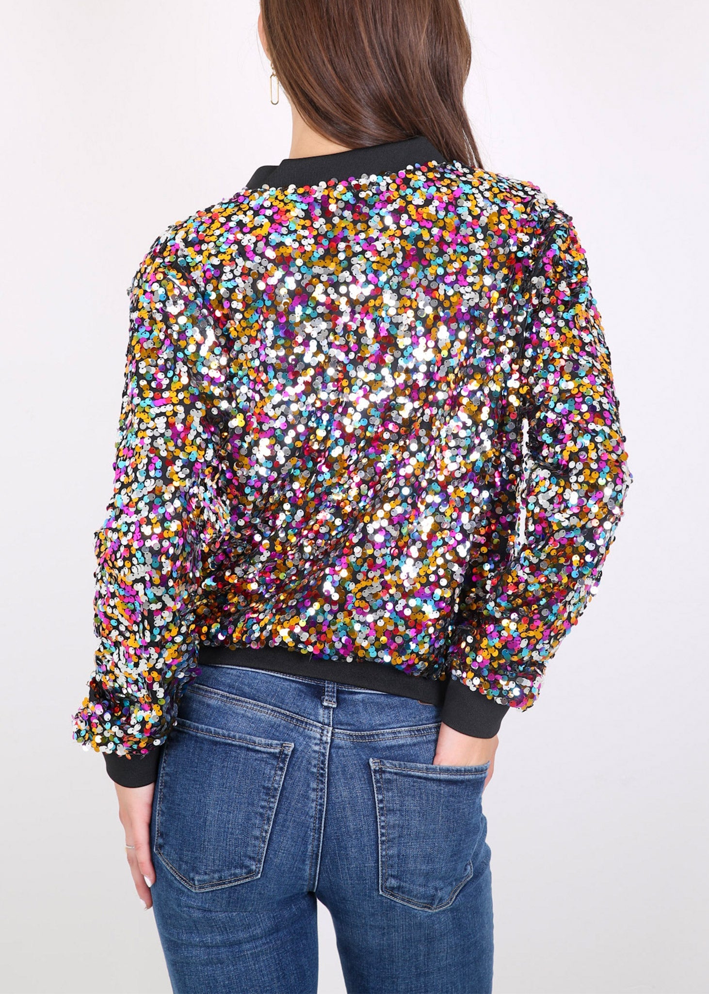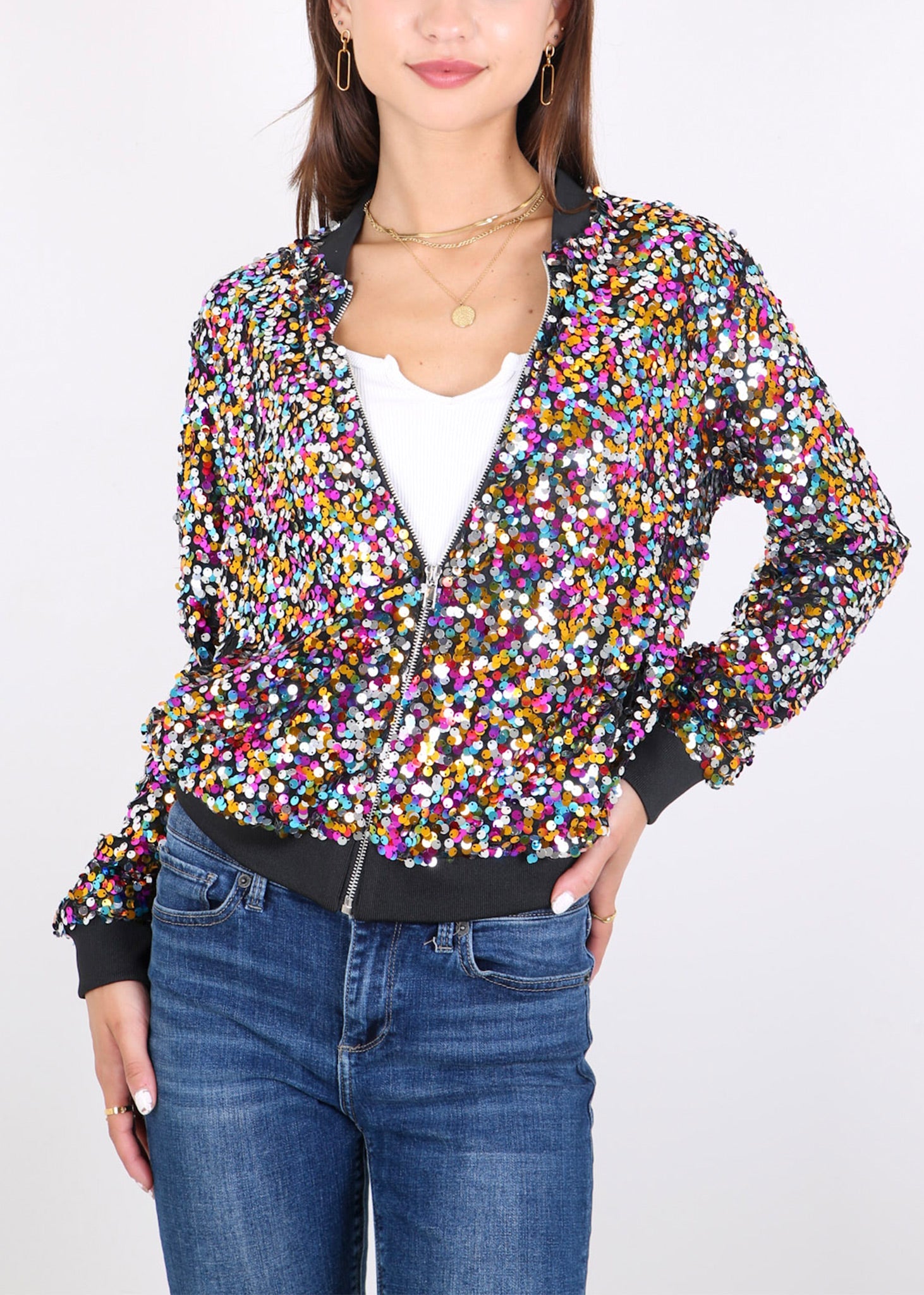 Featuring a shiny sequin zip bomber jacket with long sleeves, a v-neck, and front zipper closure.