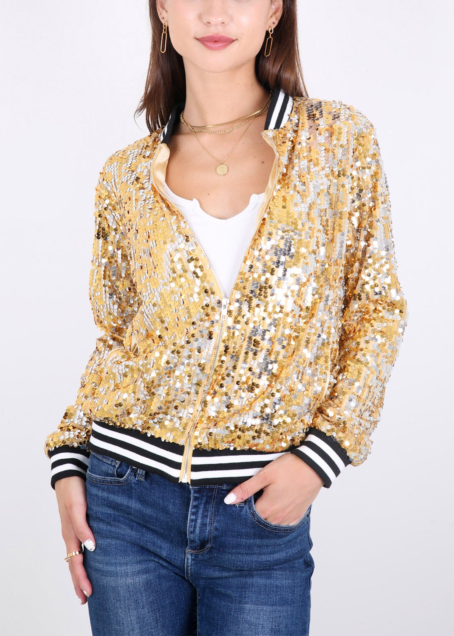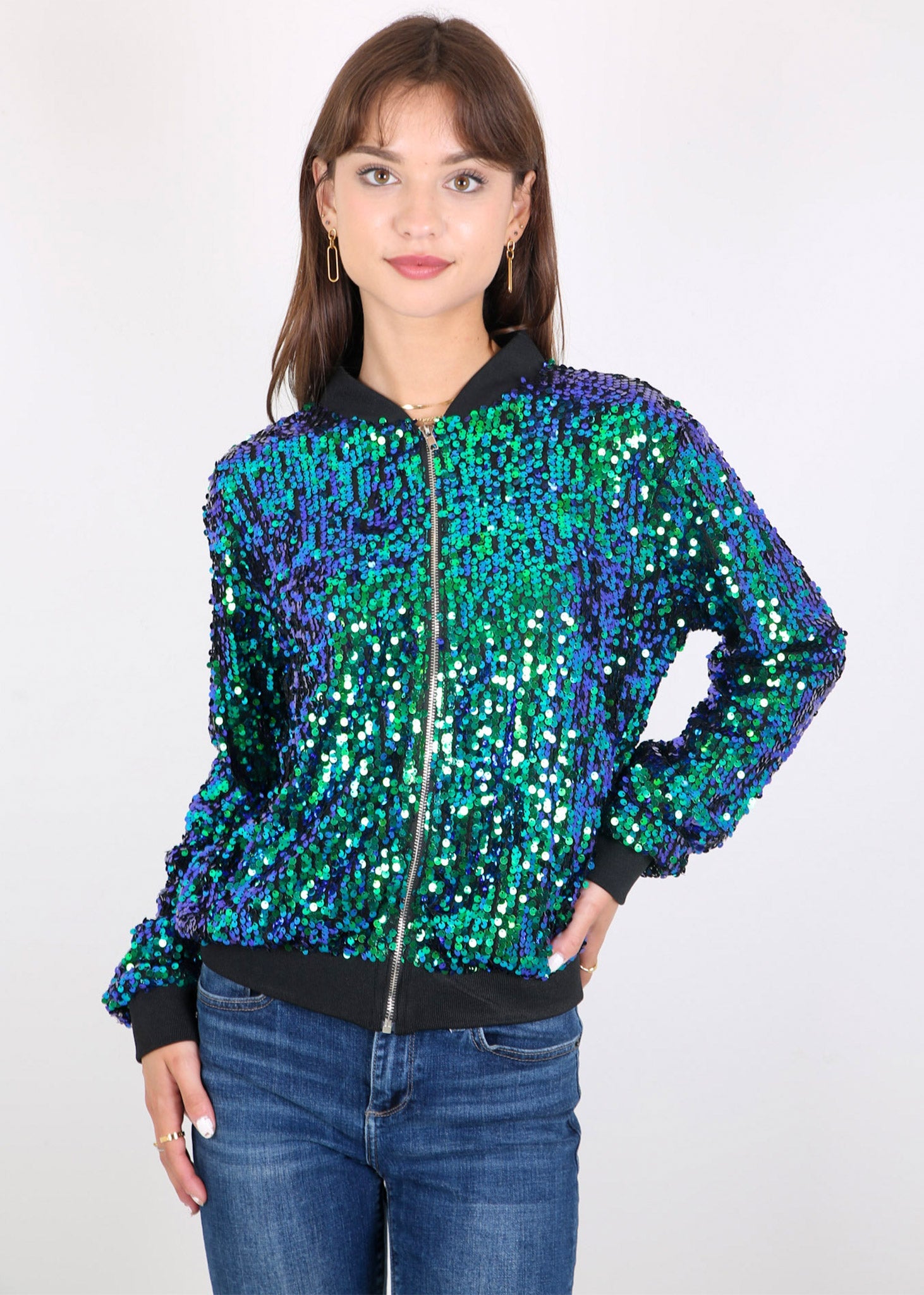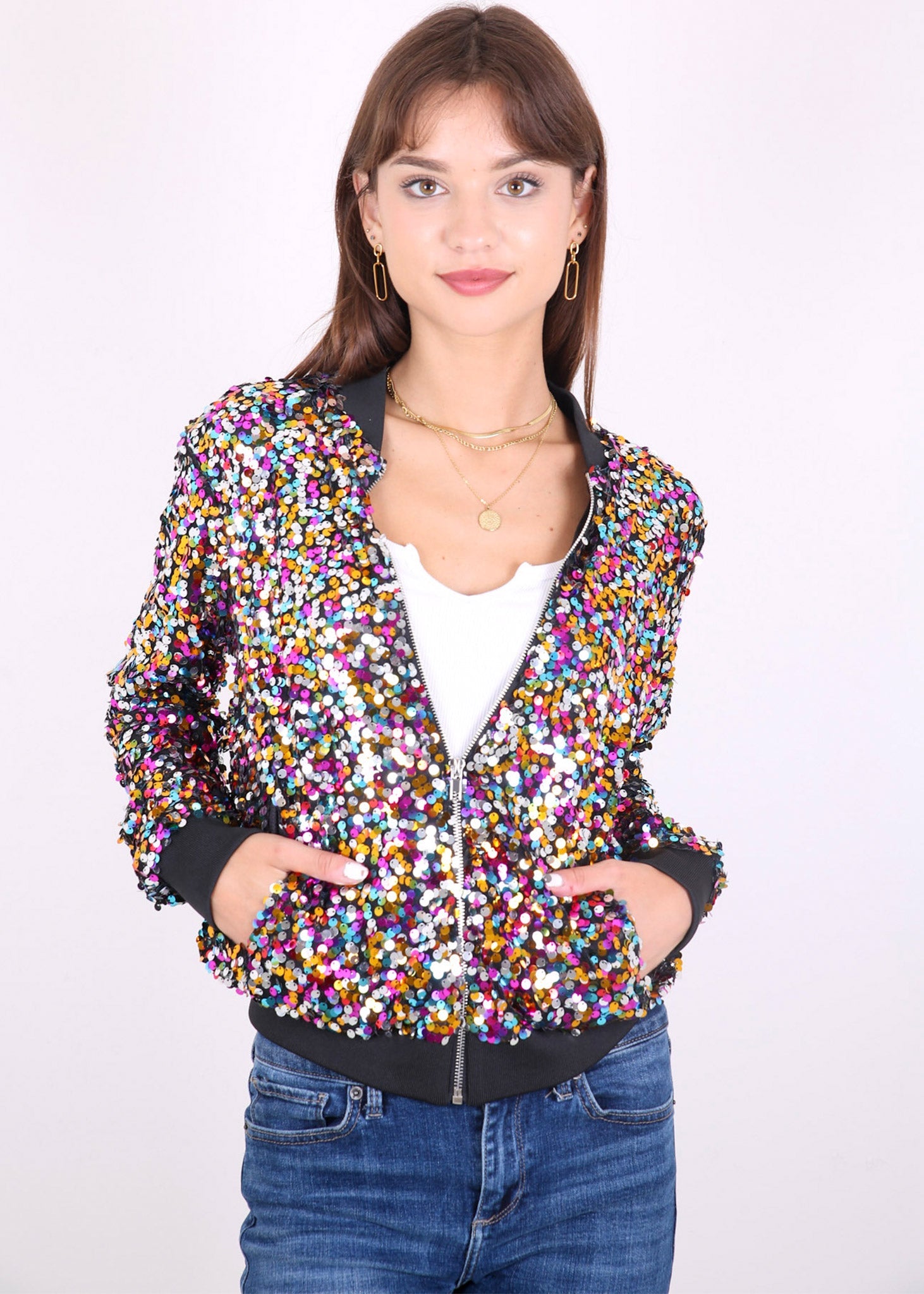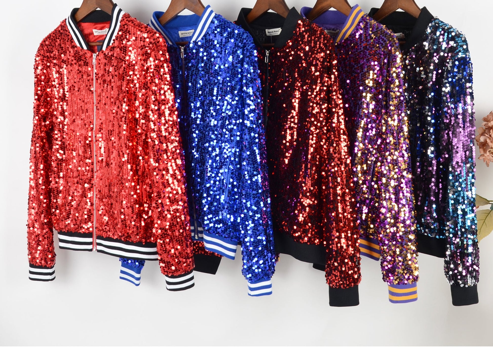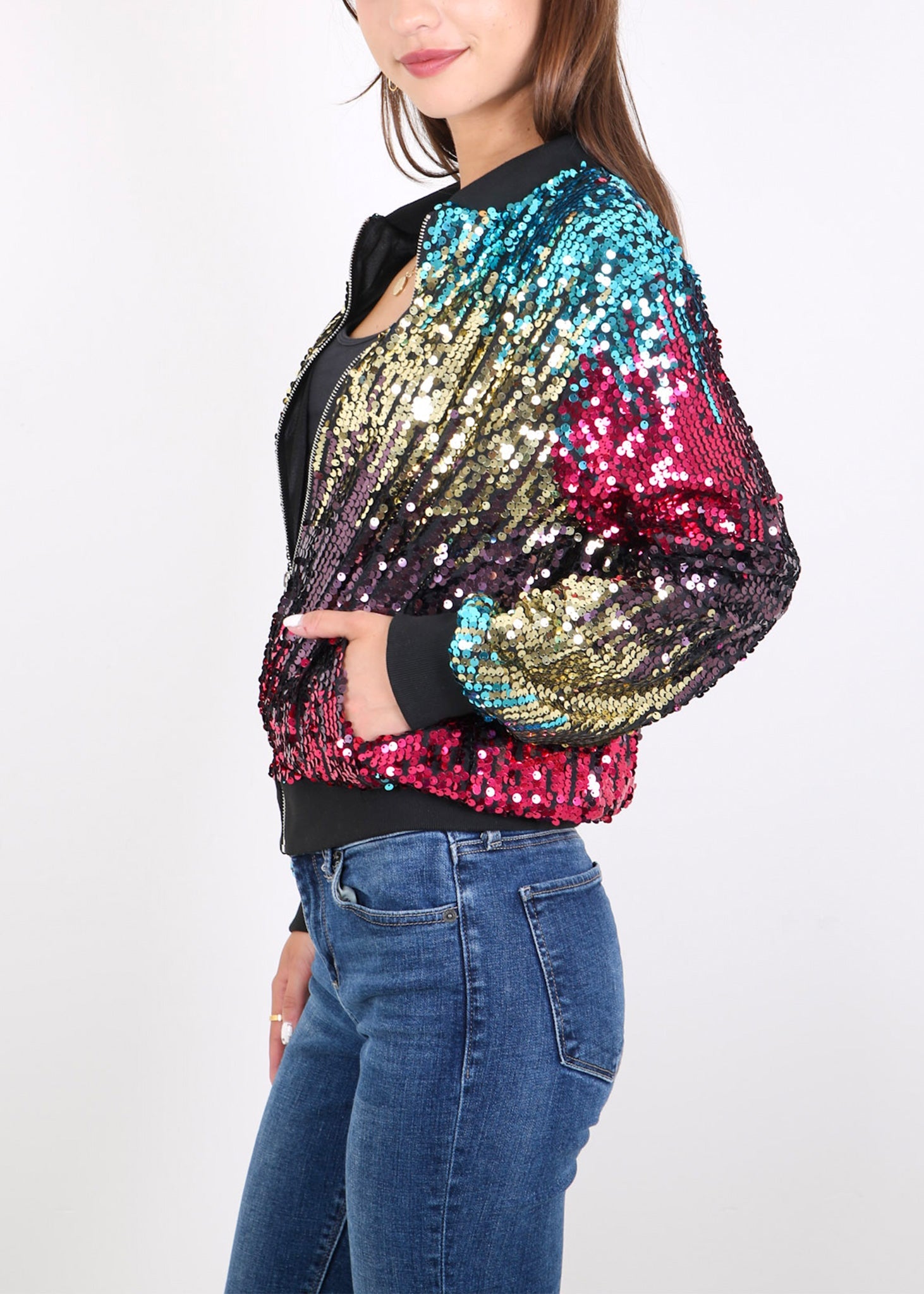 Featuring a shiny sequin zip bomber jacket with long sleeves, a v-neck, and front zipper closure.