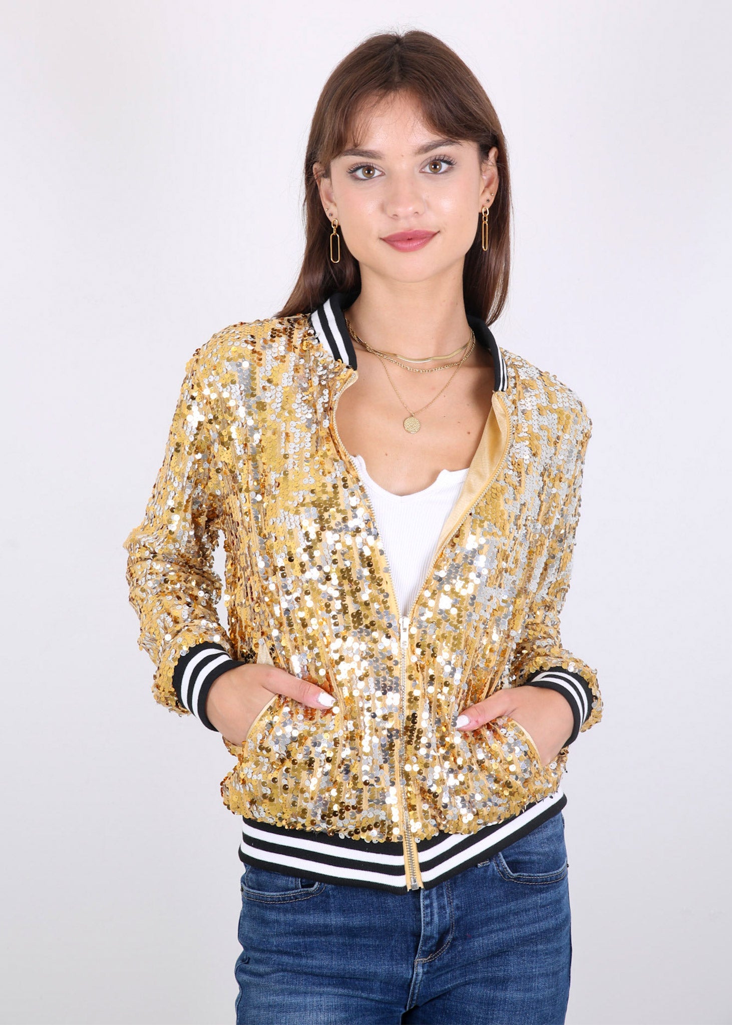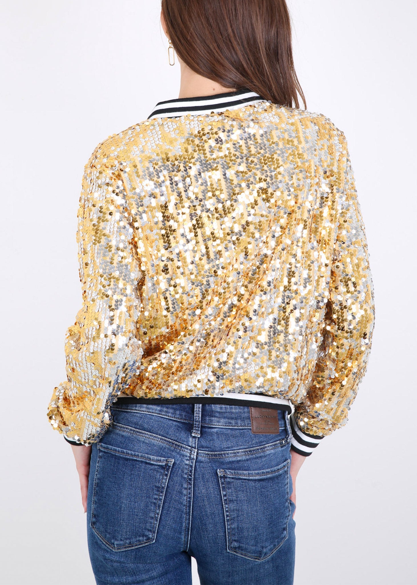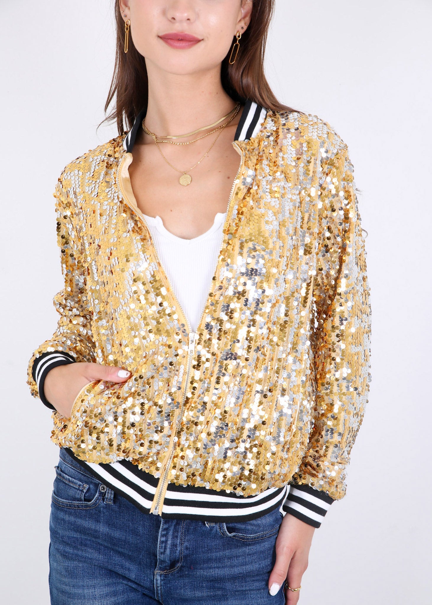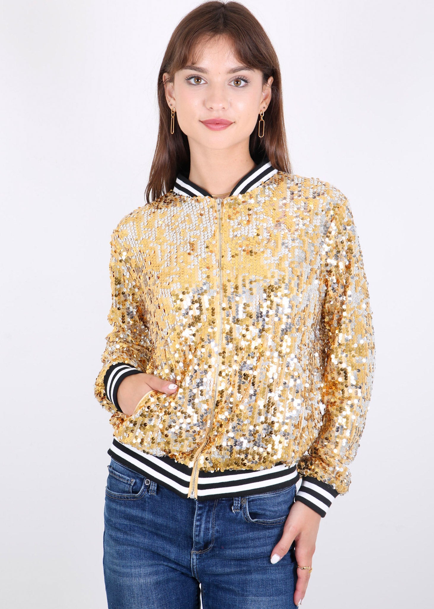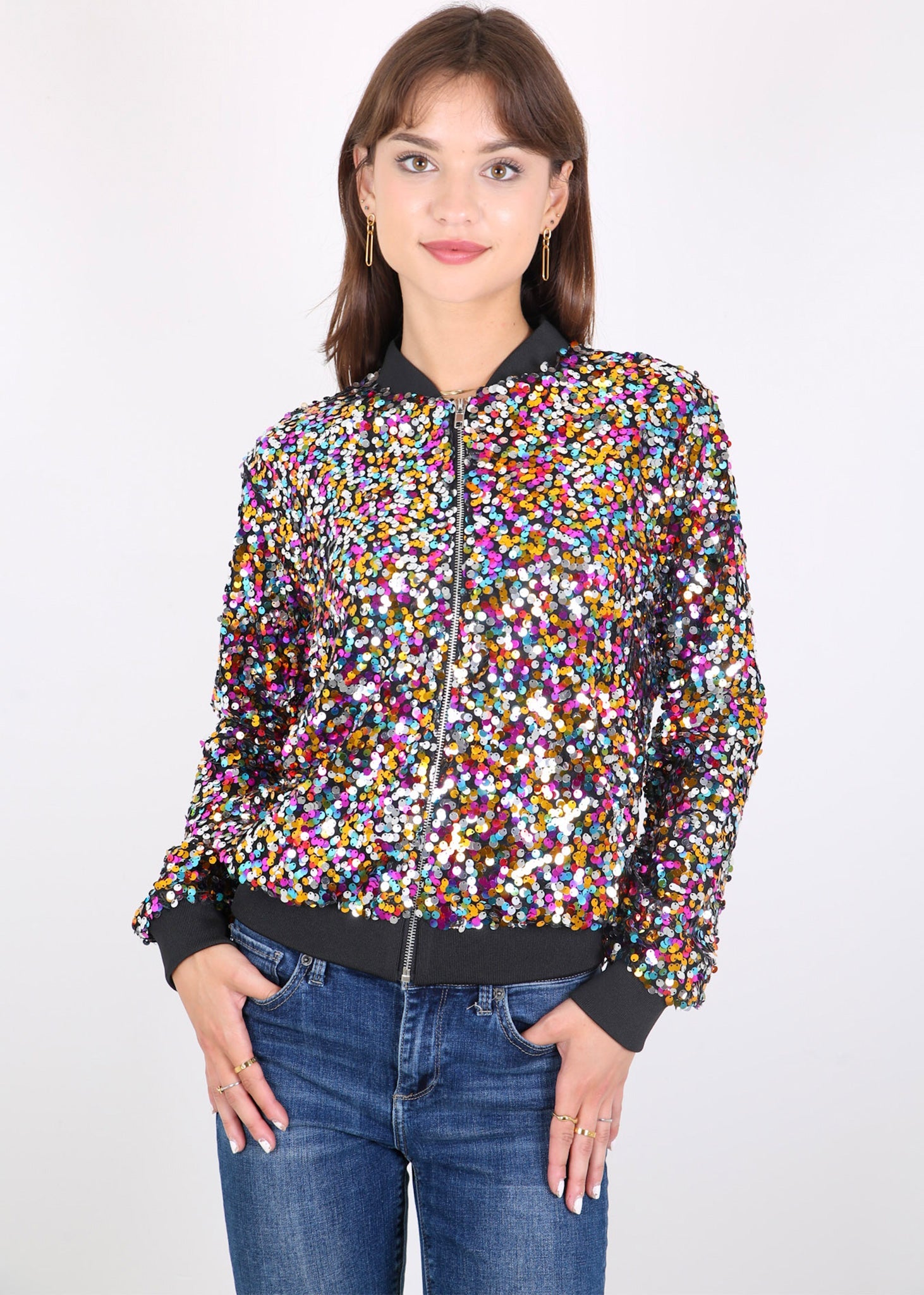Featuring a shiny sequin zip bomber jacket with long sleeves, a v-neck, and front zipper closure.