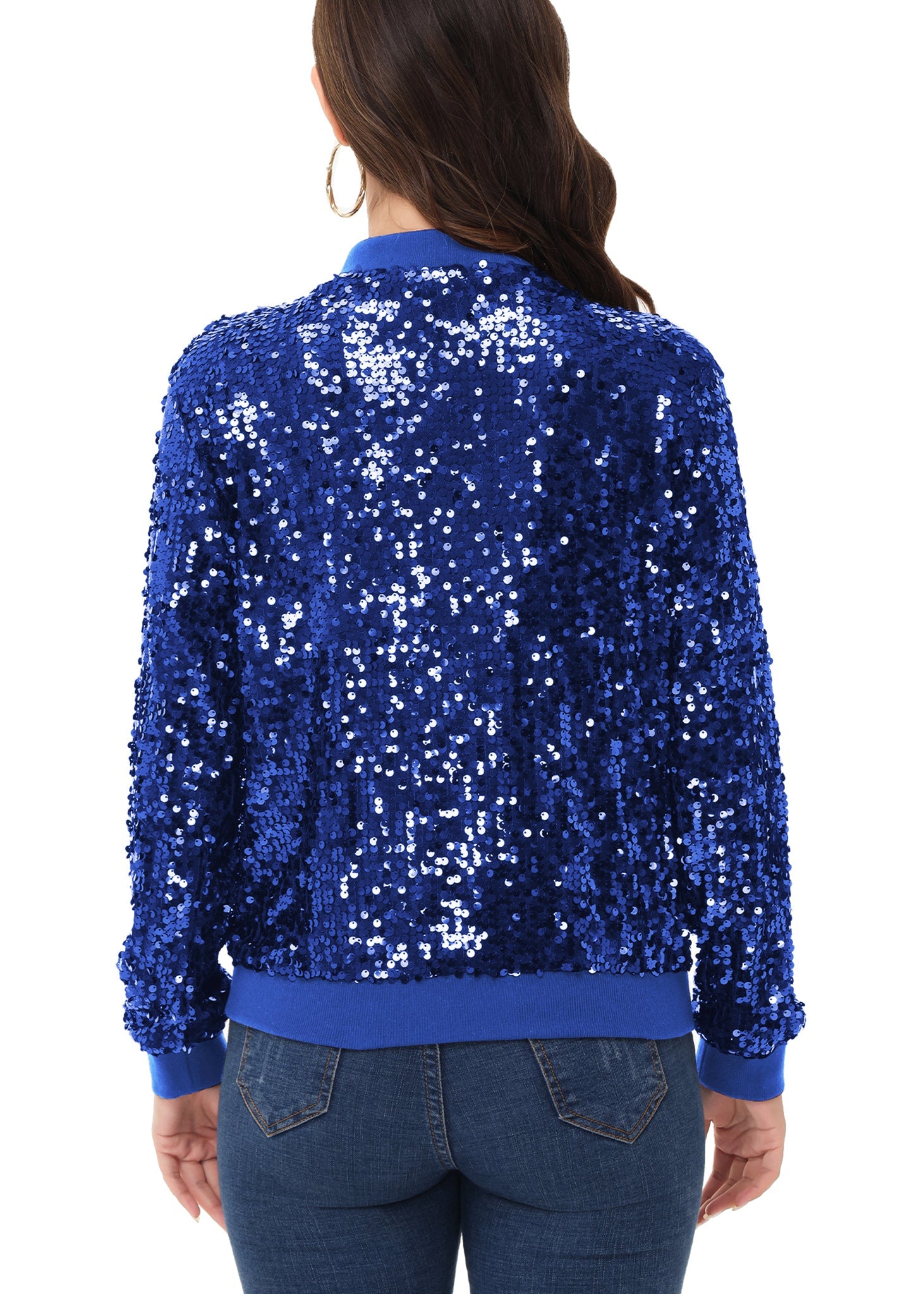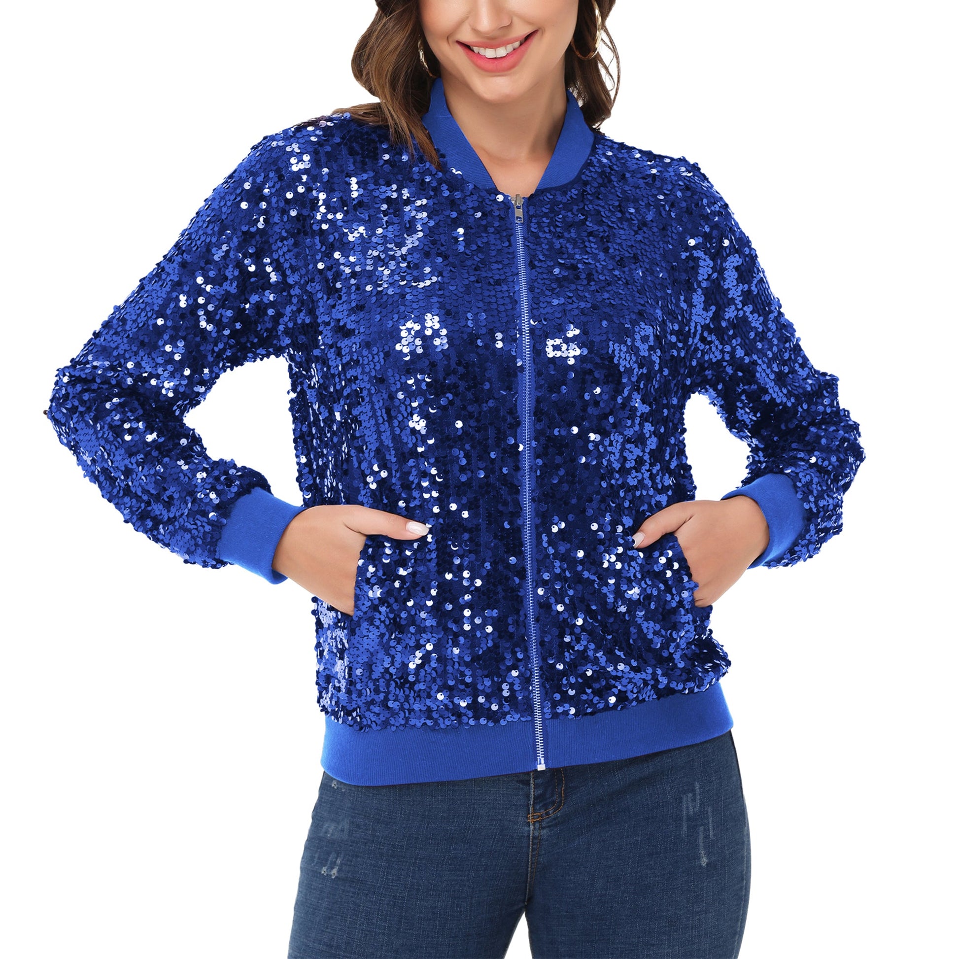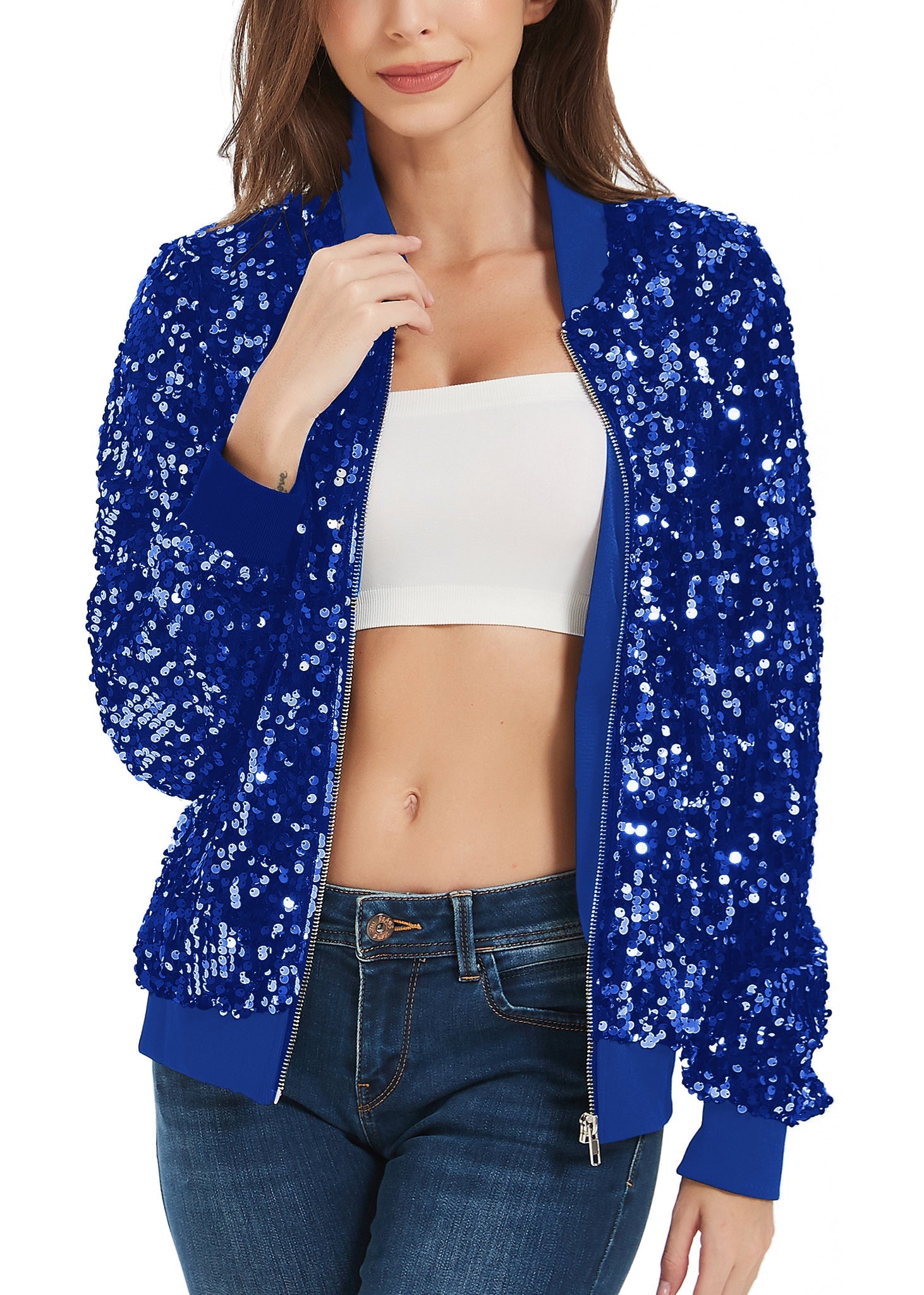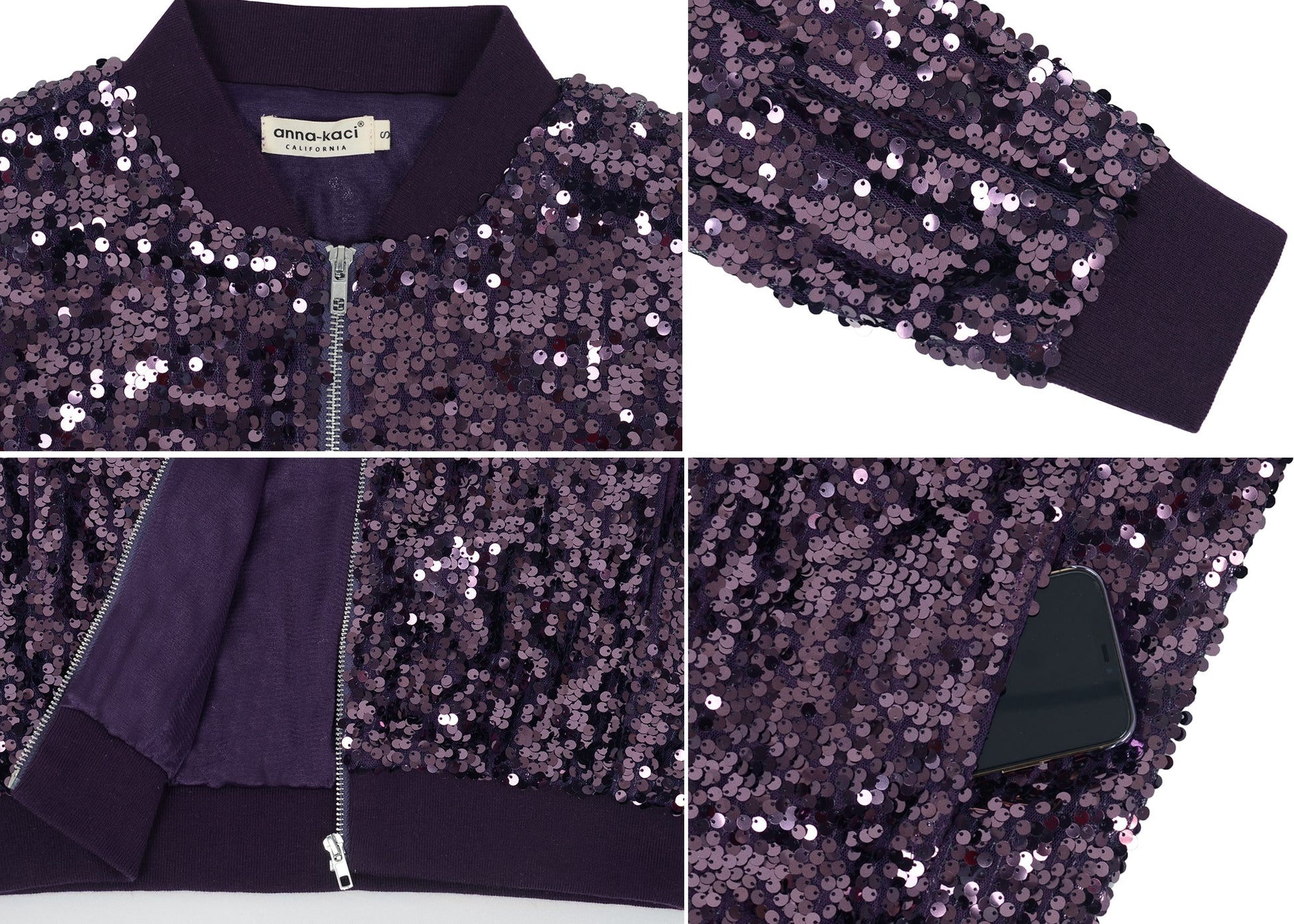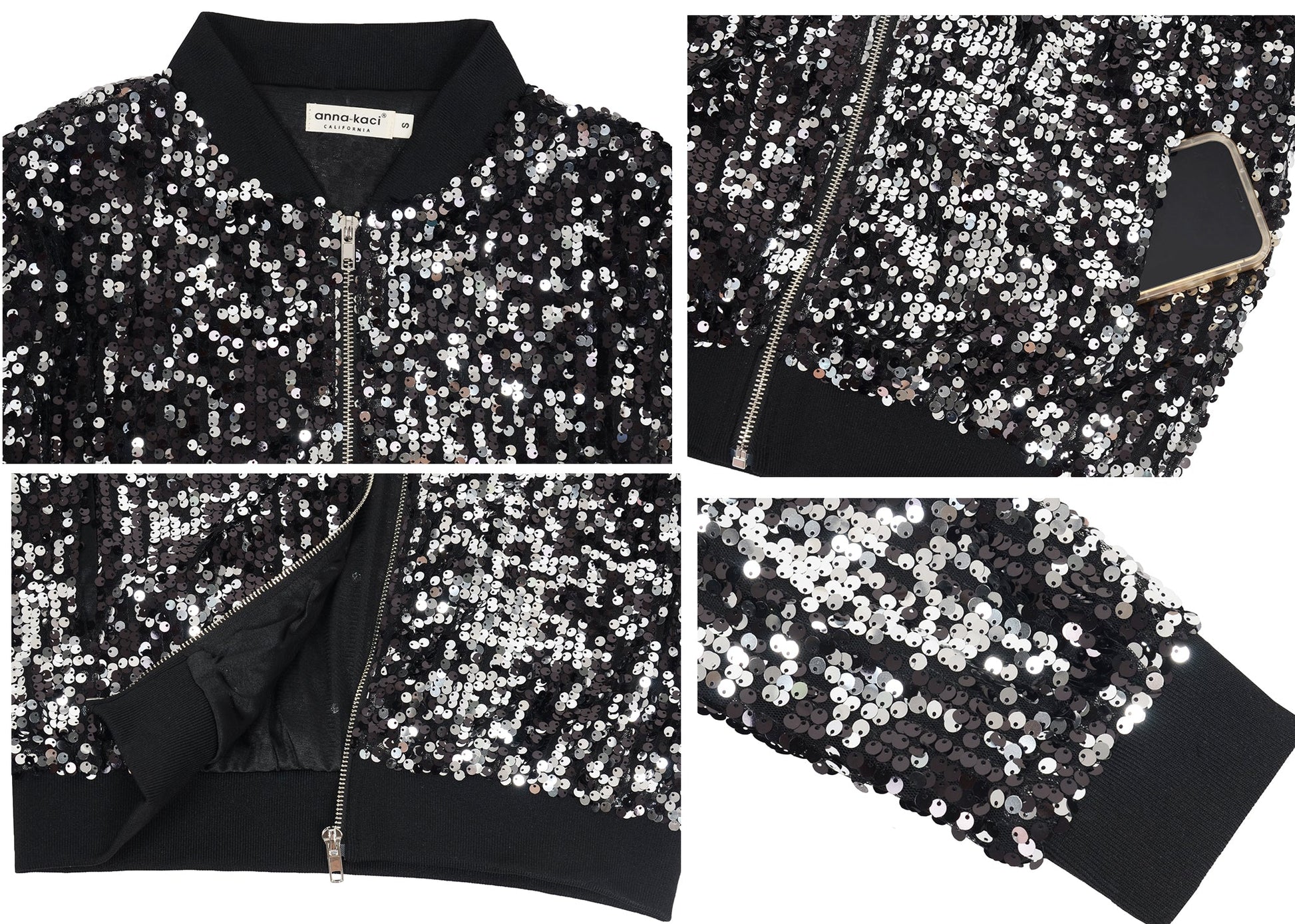 Anna-Kaci Womens Sequin Jacket Sparkle Long Sleeve Front Zip Casual Blazer Bomber Jacket With Pockets