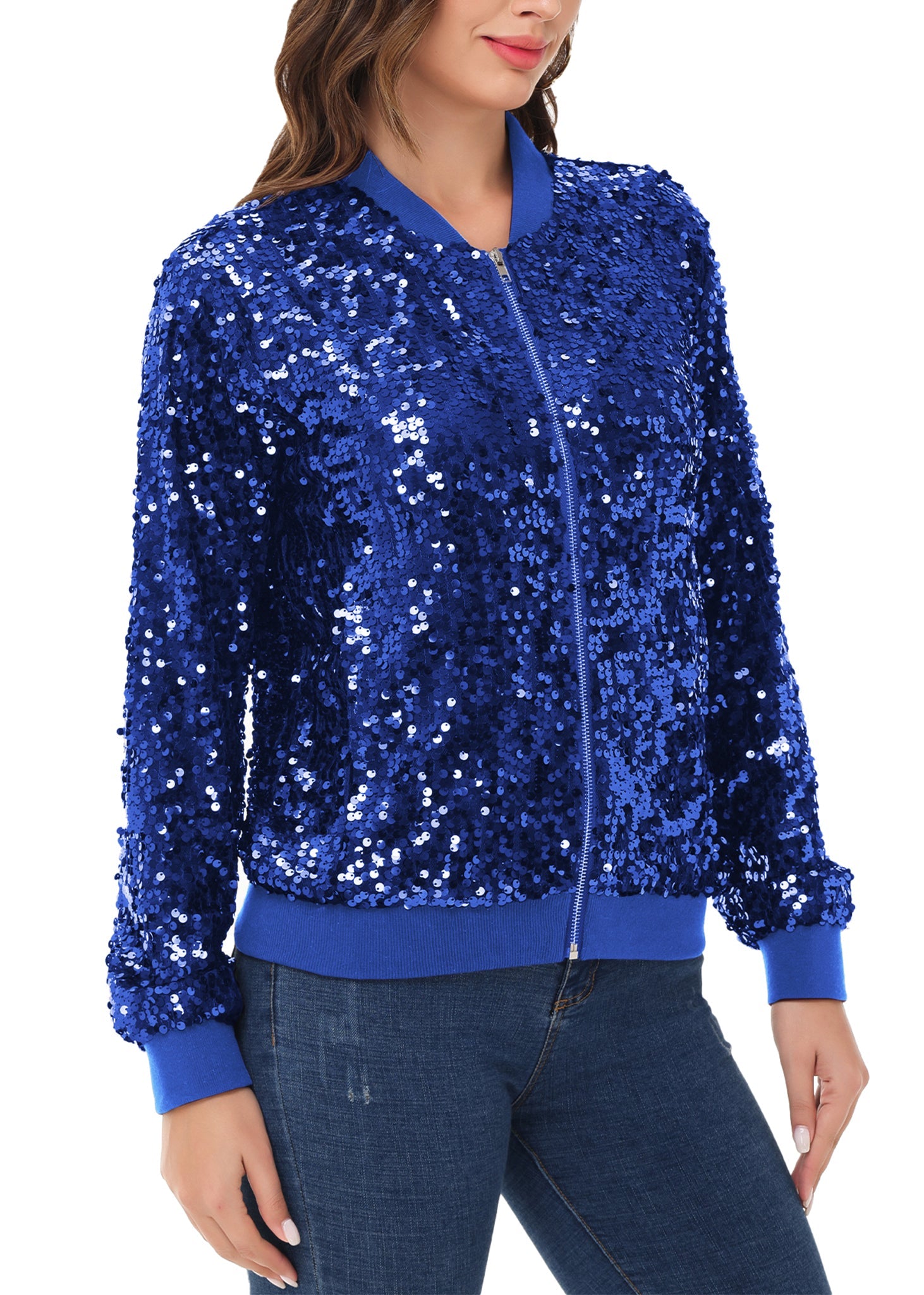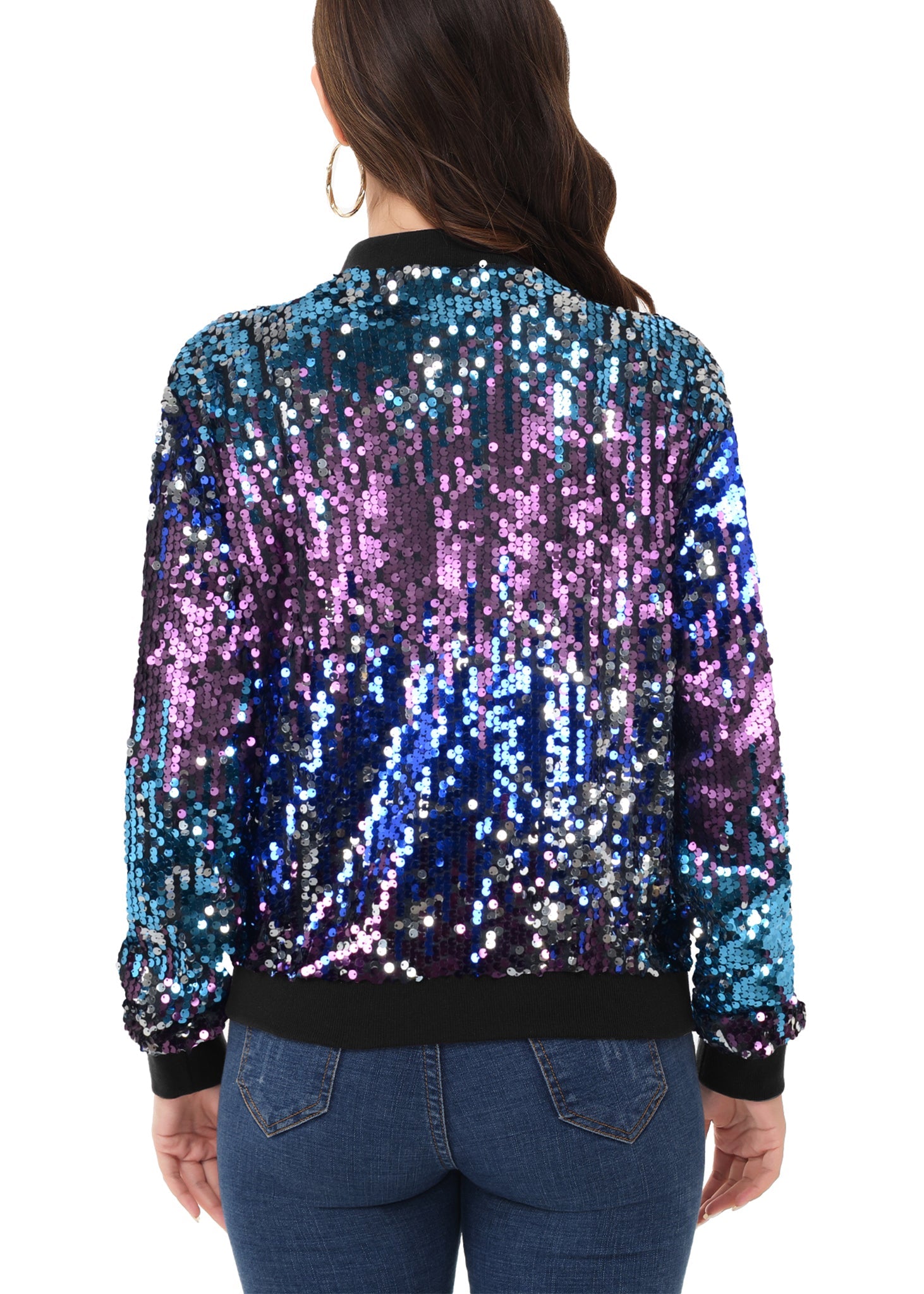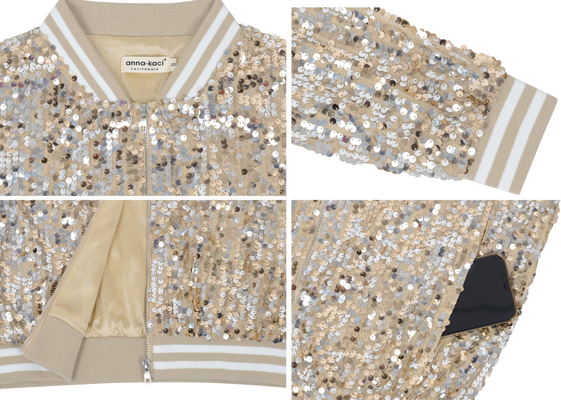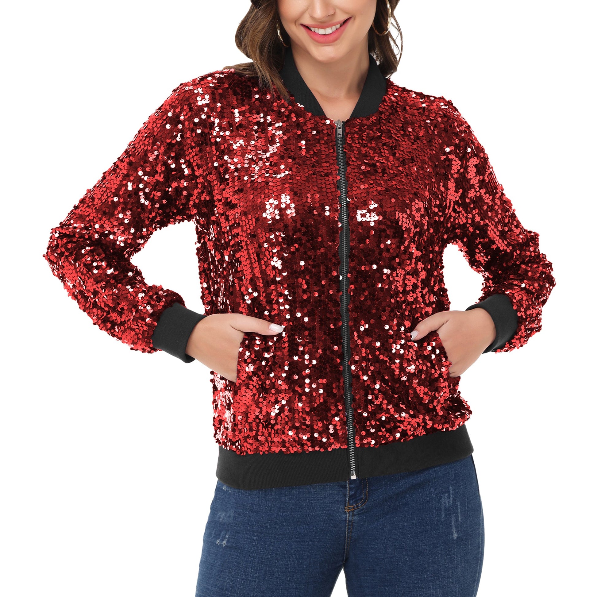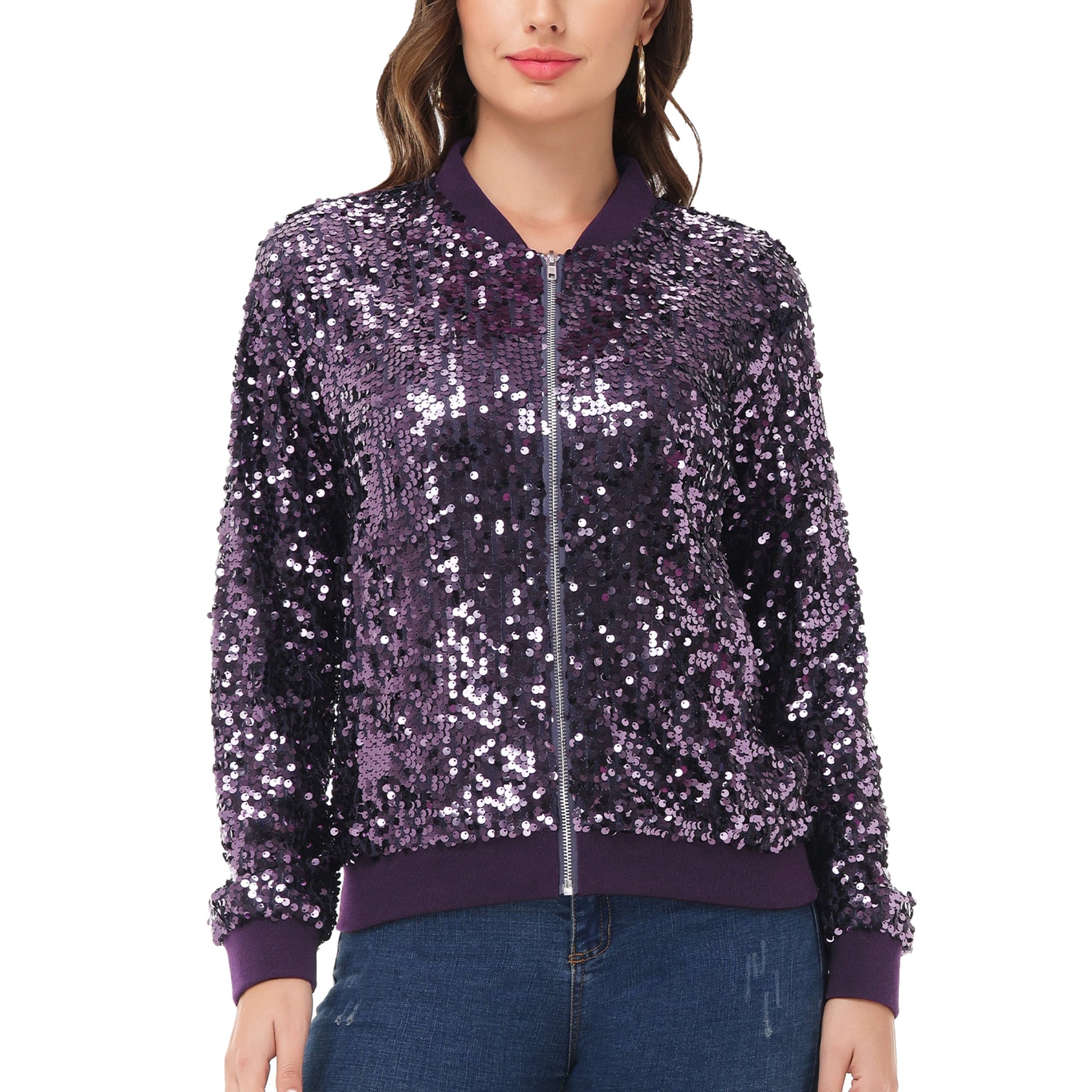 Anna-Kaci Womens Sequin Jacket Sparkle Long Sleeve Front Zip Casual Blazer Bomber Jacket With Pockets