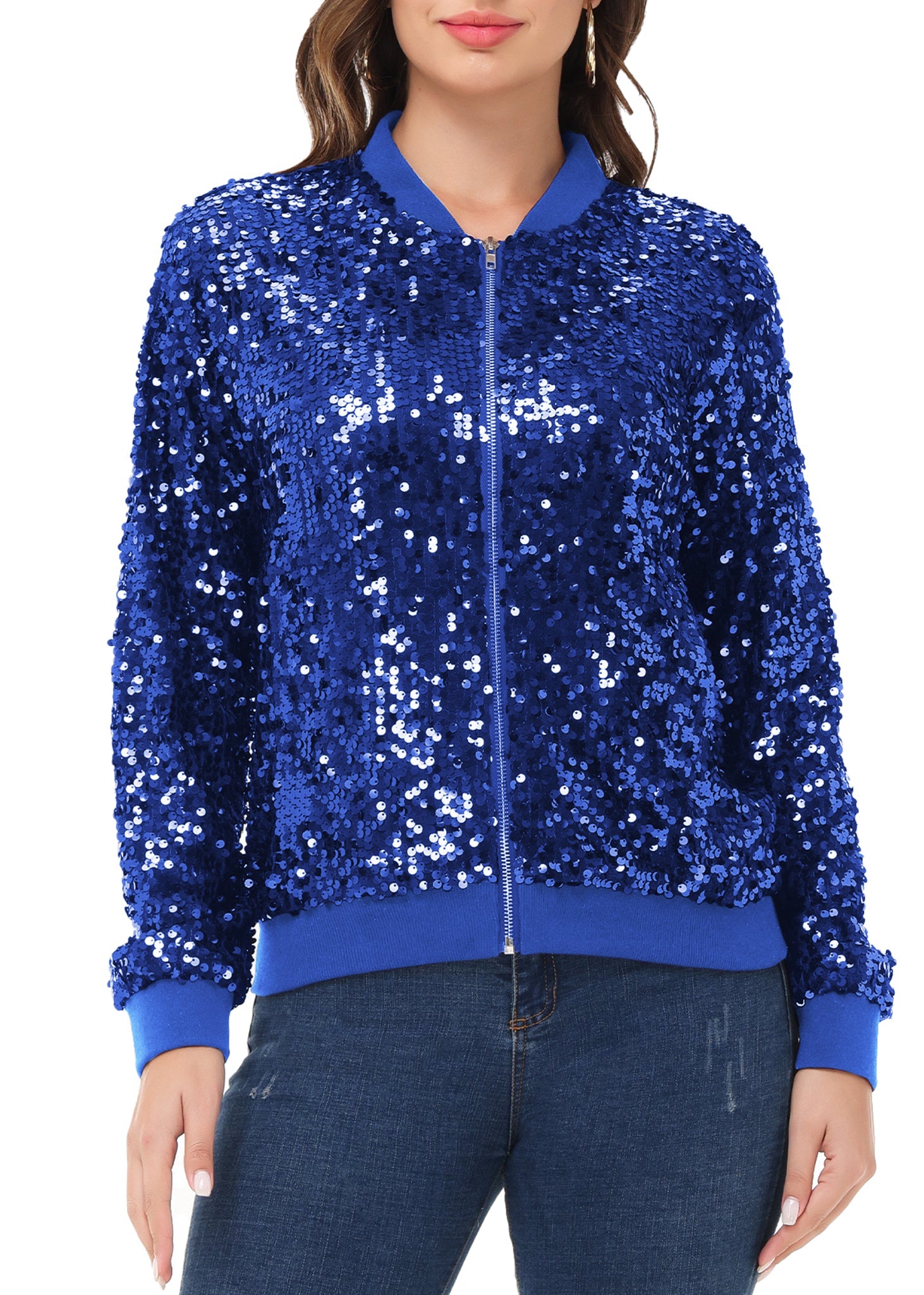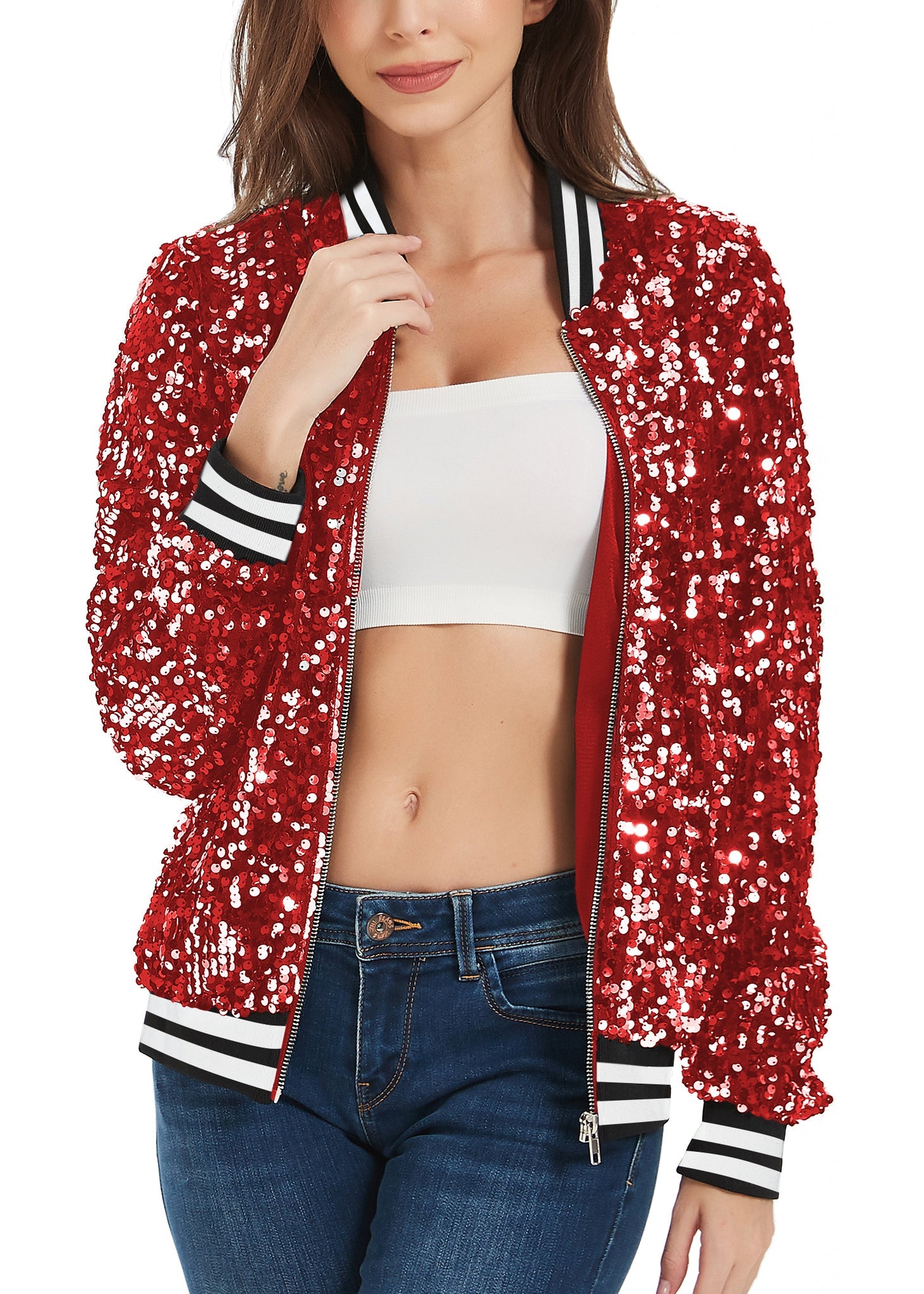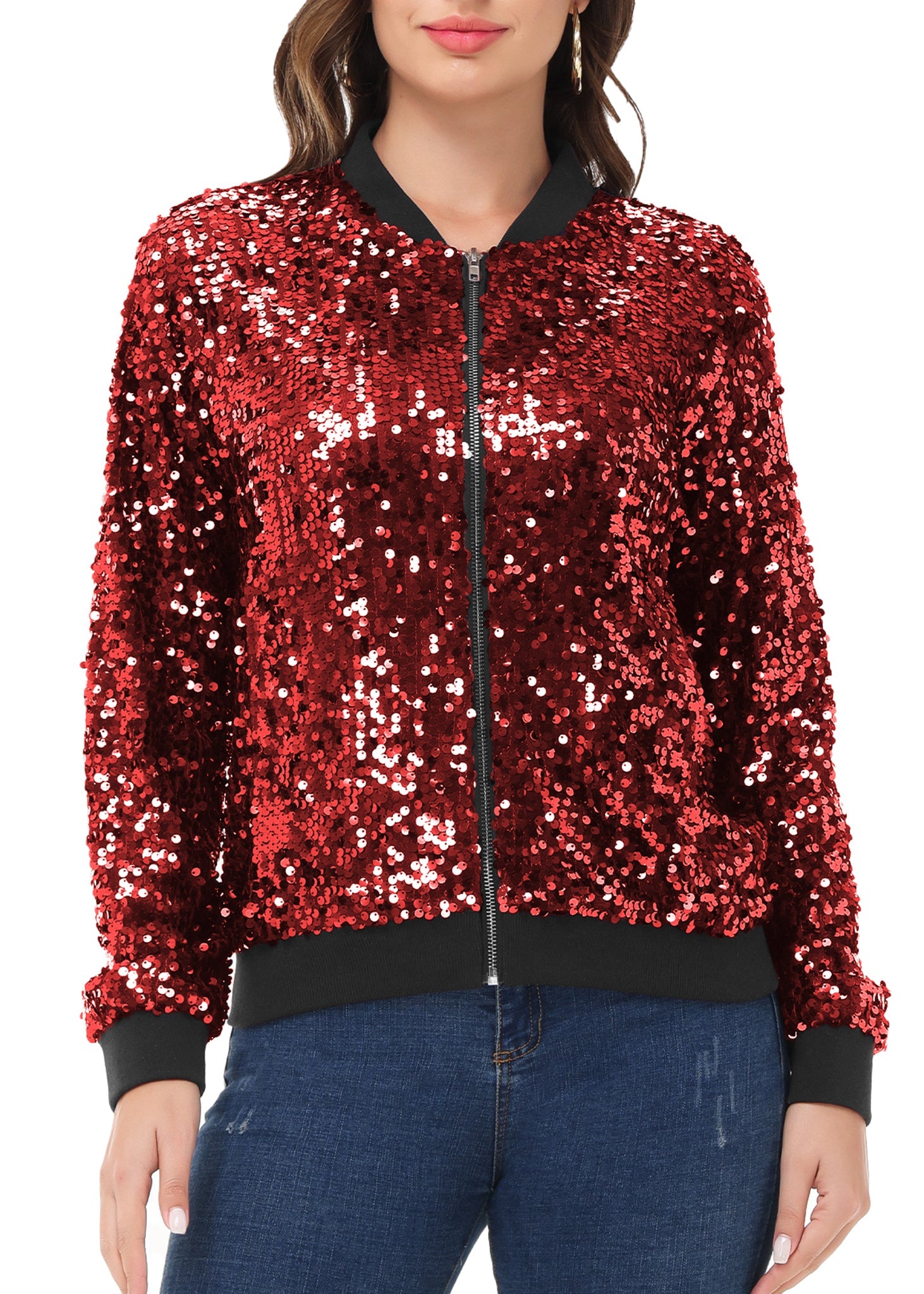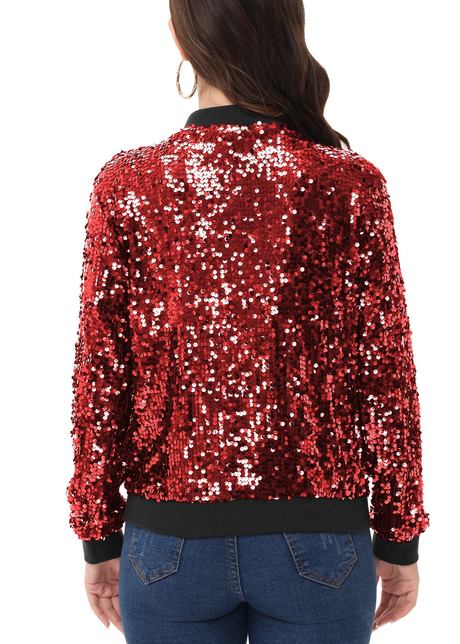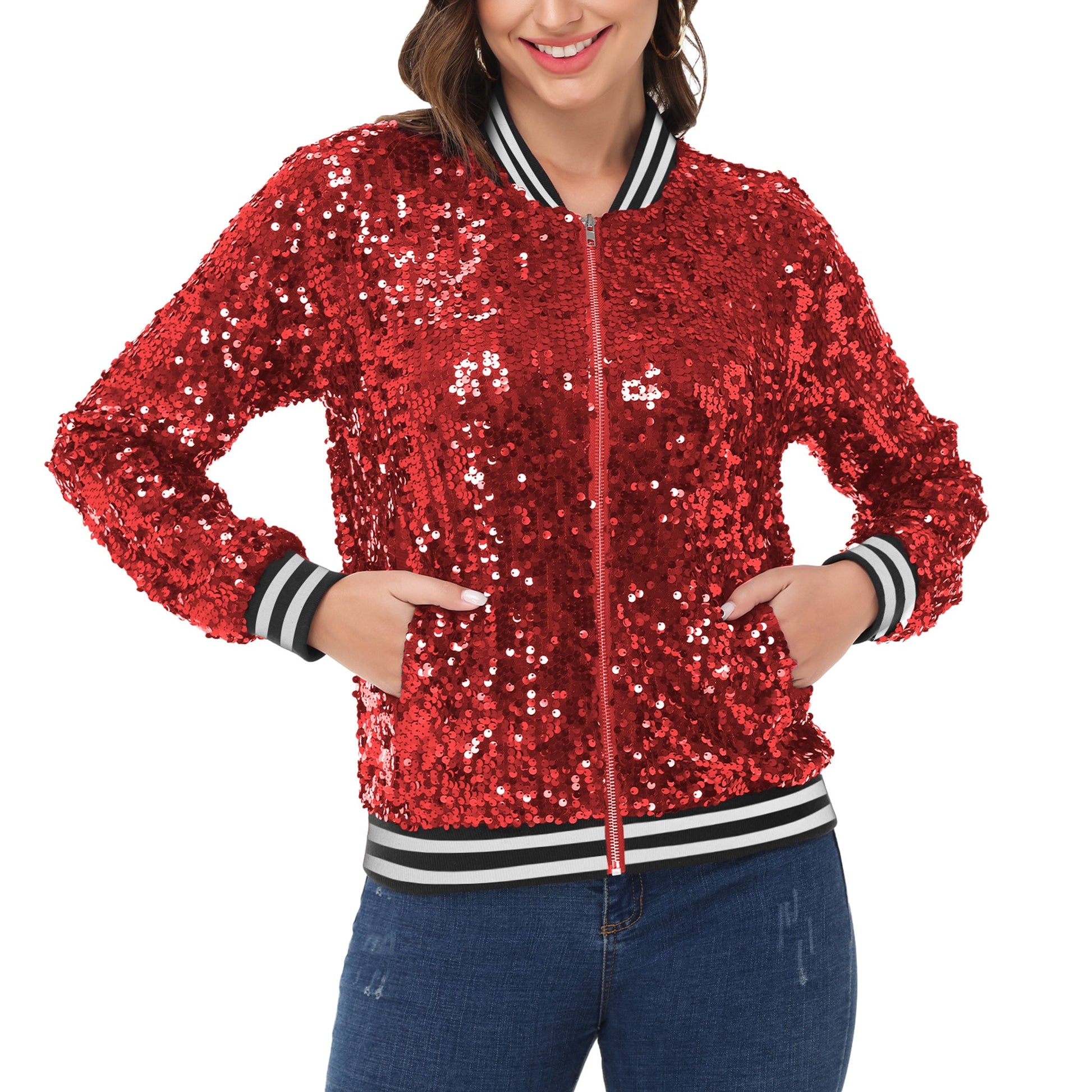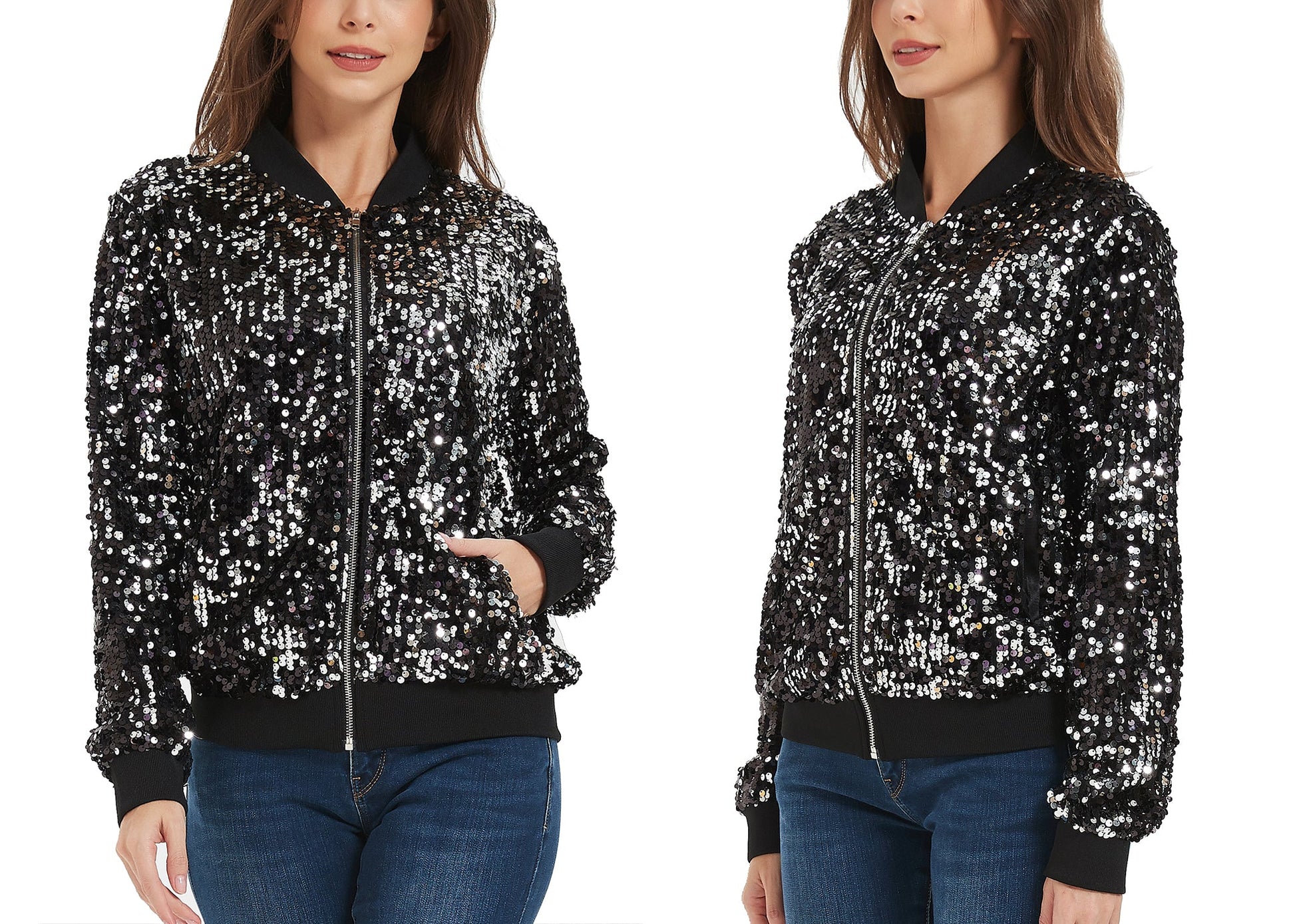 Anna-Kaci Womens Sequin Jacket Sparkle Long Sleeve Front Zip Casual Blazer Bomber Jacket With Pockets
