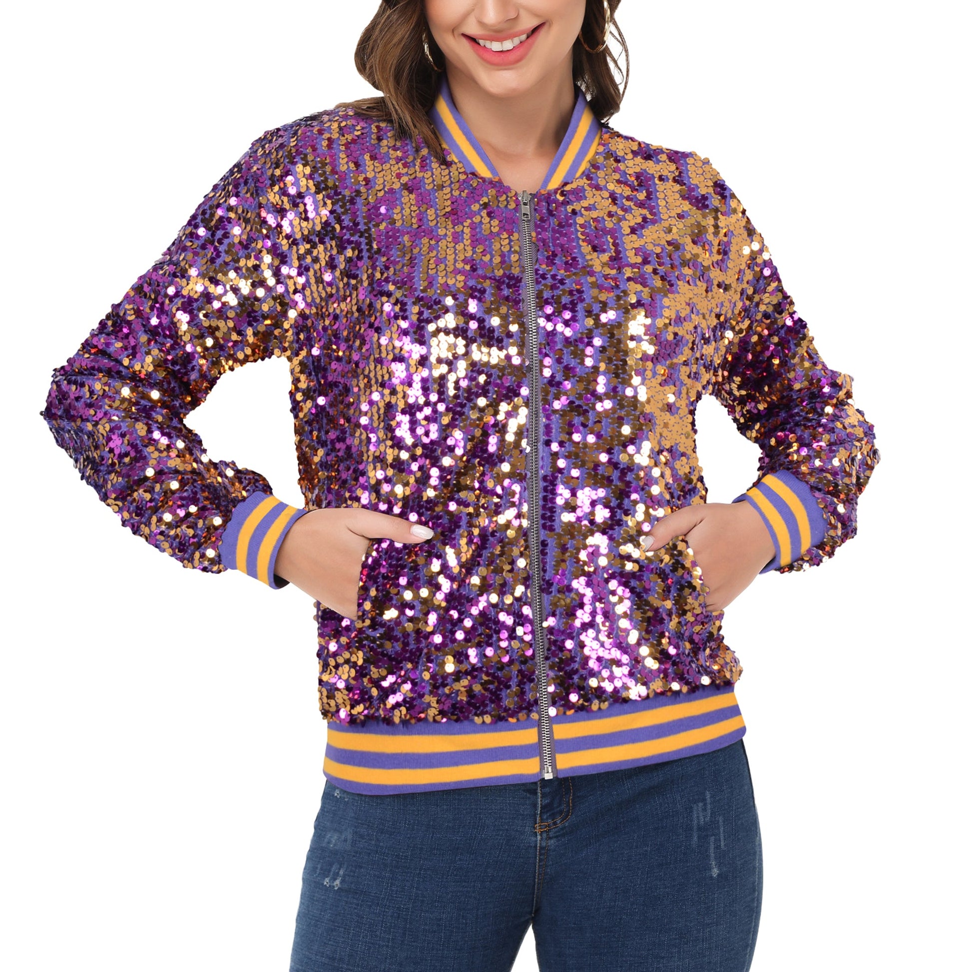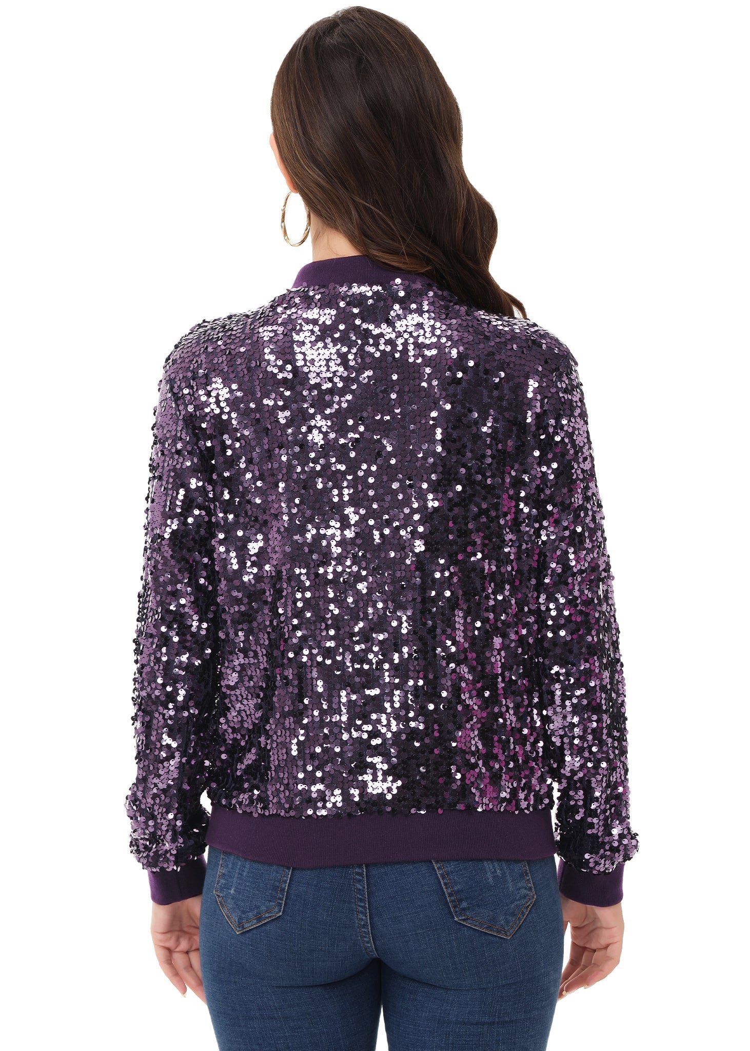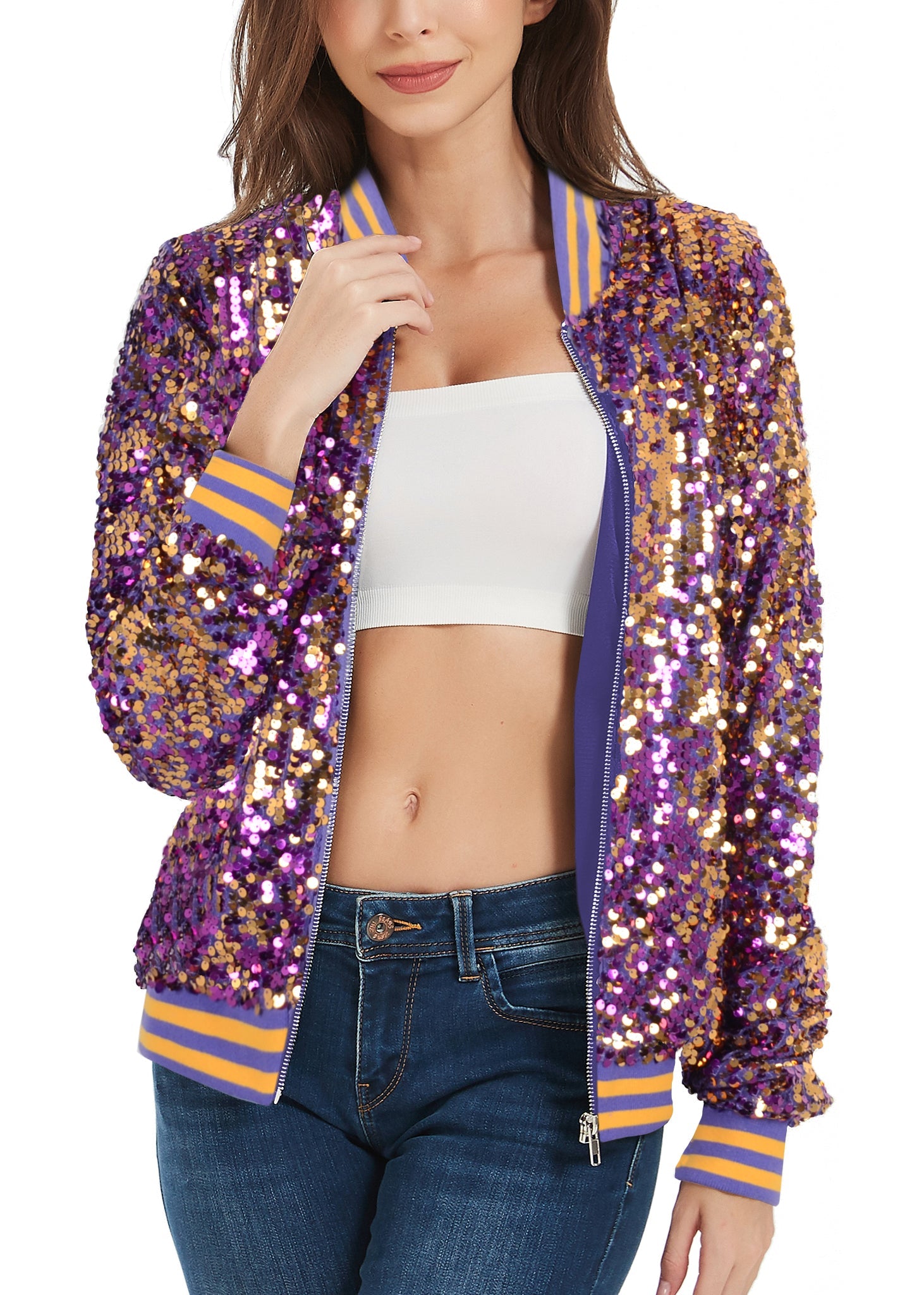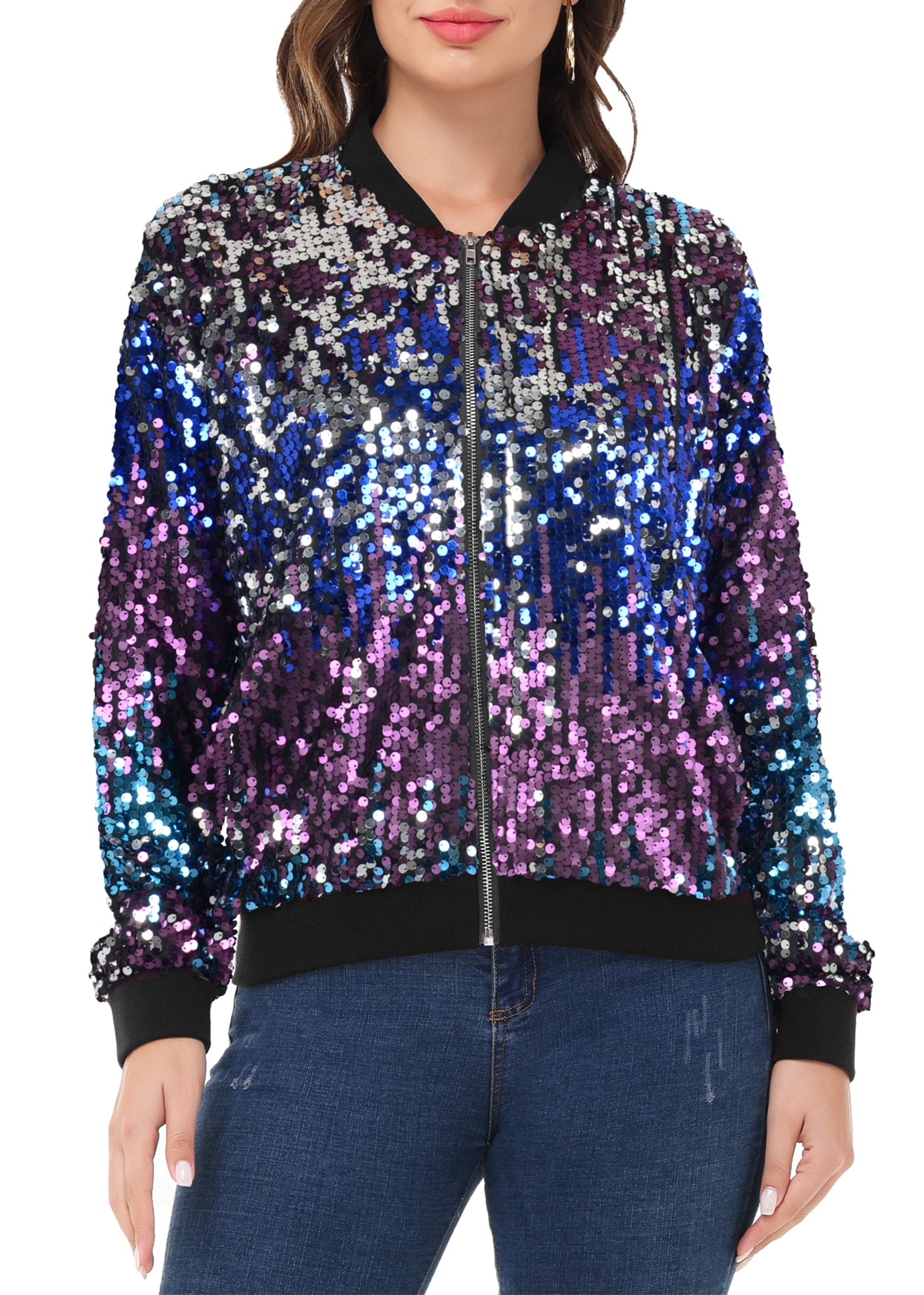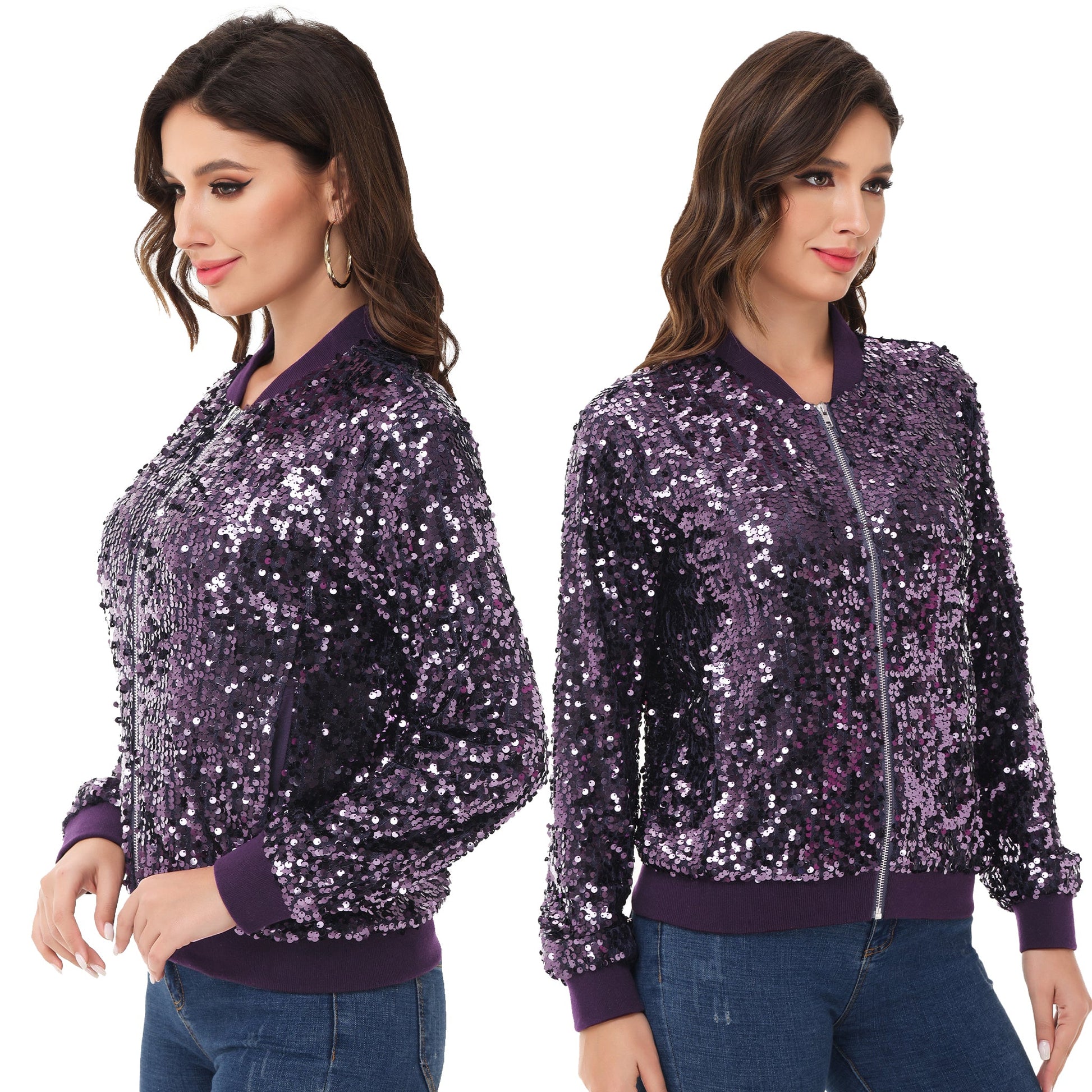 Anna-Kaci Womens Sequin Jacket Sparkle Long Sleeve Front Zip Casual Blazer Bomber Jacket With Pockets