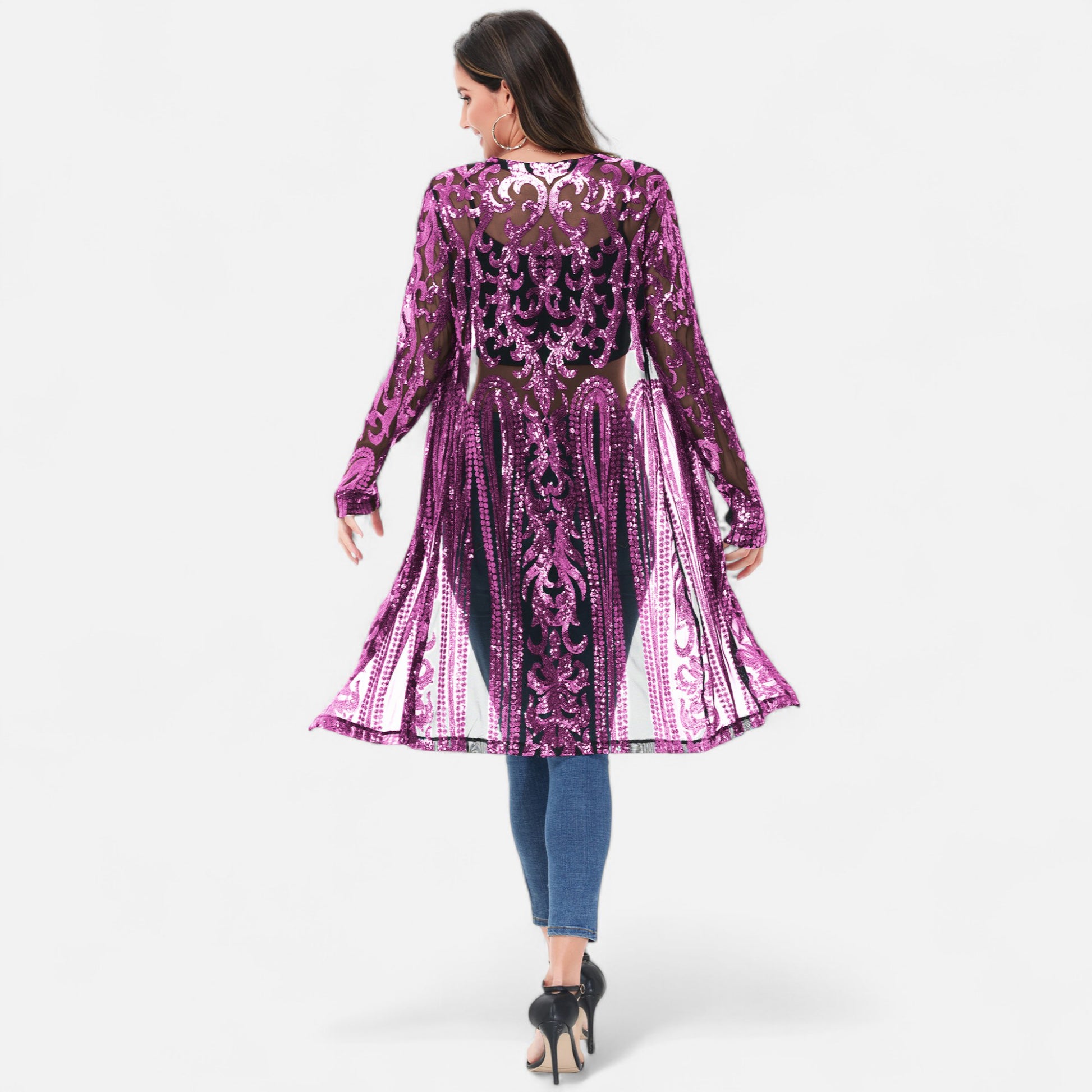 The Anna-Kaci Women's Long Sequin Cardigan Open Front Sheer Duster Jacket is a glamorous and stylish addition to your wardrobe. Made from lightweight, sheer fabric, this duster jacket features all-over sequins that add a touch of sparkle and sophistication to any outfit. The open front design and long length provide a flattering and elegant silhouette, perfect for layering over dresses, tops, or even swimwear. Ideal for special occasions, evening events, or whenever you want to make a statement, this sequin duster jacket pairs effortlessly with your favorite ensembles for a chic and eye-catching look. Perfect for a mom on the go or anyone who loves to add a bit of glamour to their style, this sheer sequin cardigan is a must-have for any fashion-forward wardrobe.