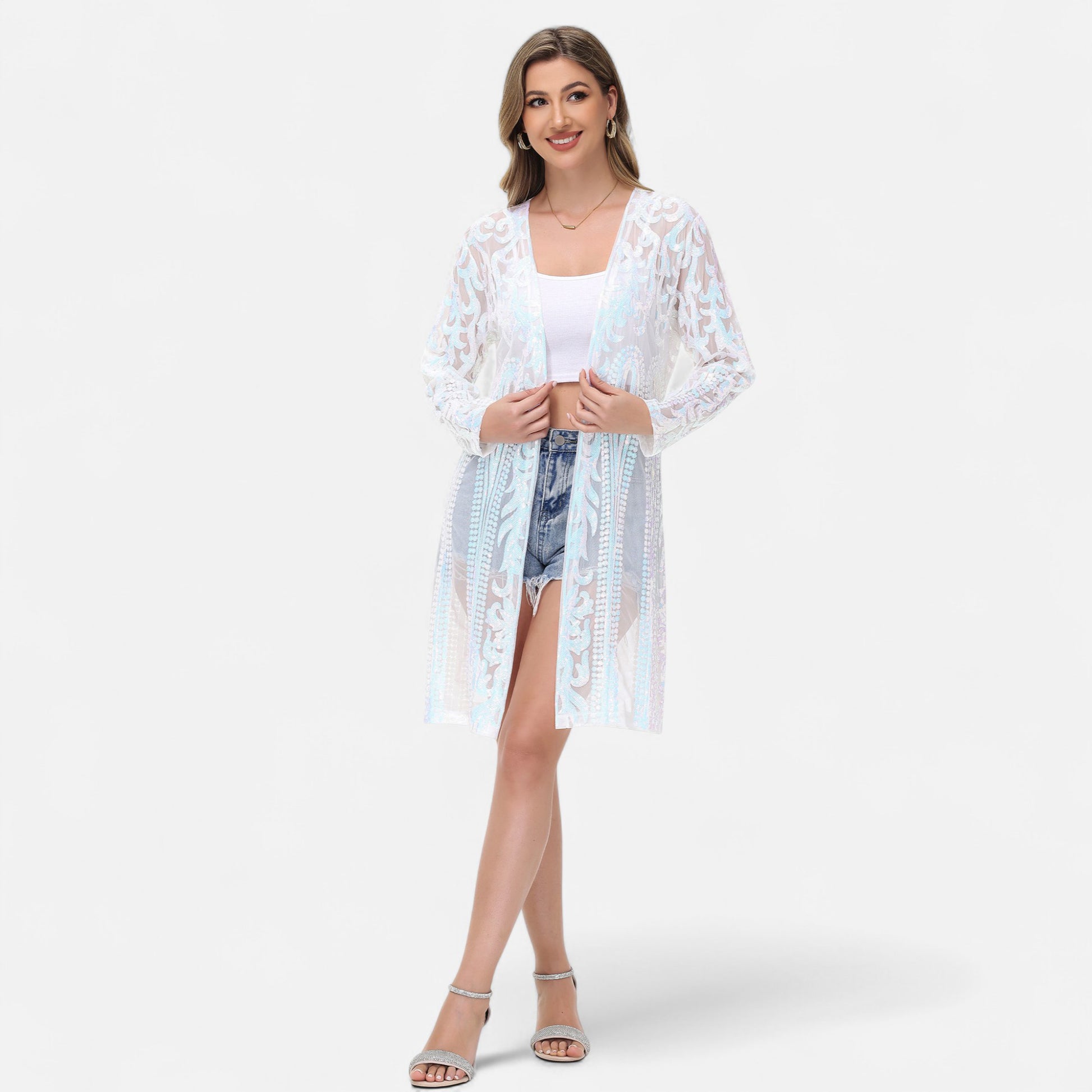 Long Sequin Cardigan Open Front Sheer Duster Jacket