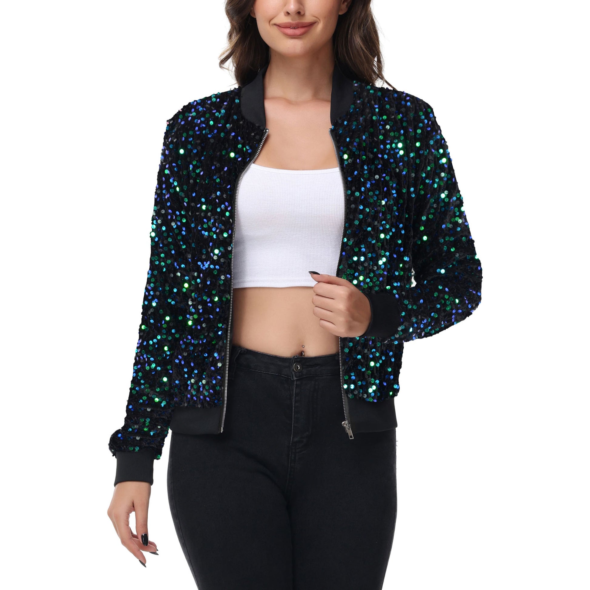 Sequin Bomber Jacket Zip Front Ribbed Cuffs and Hem Pockets