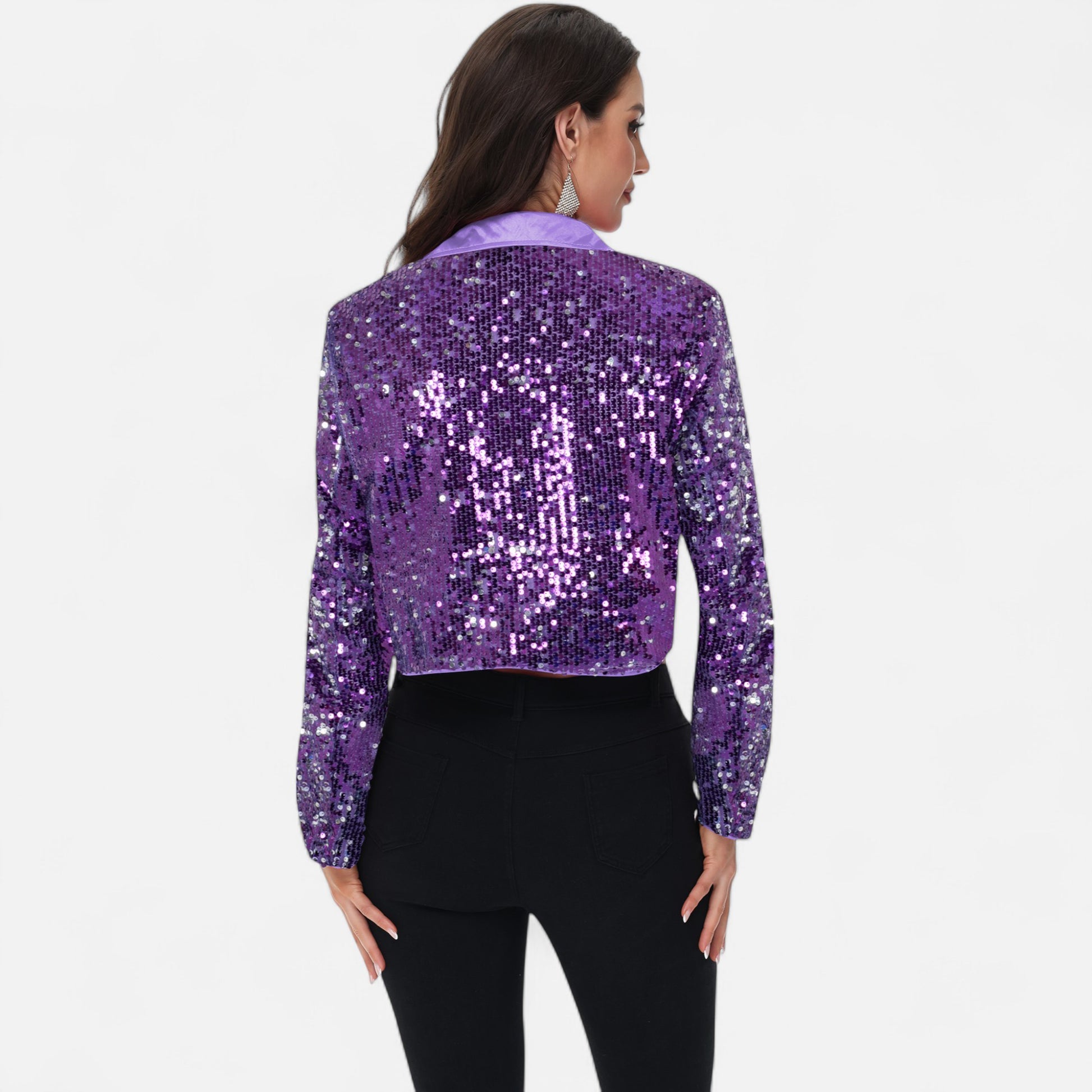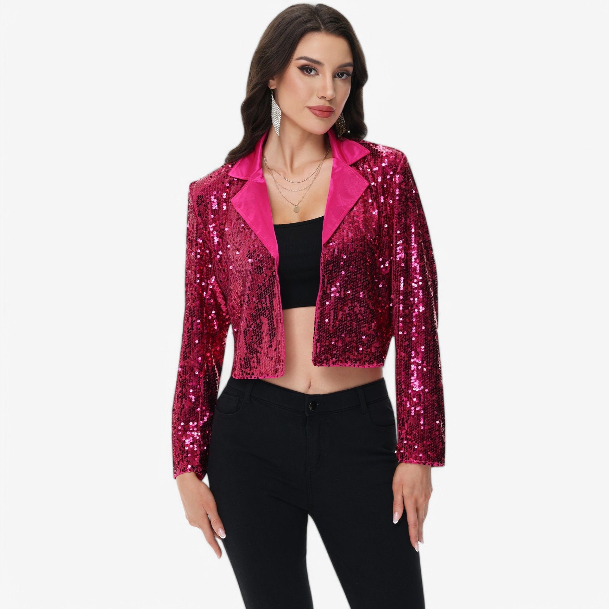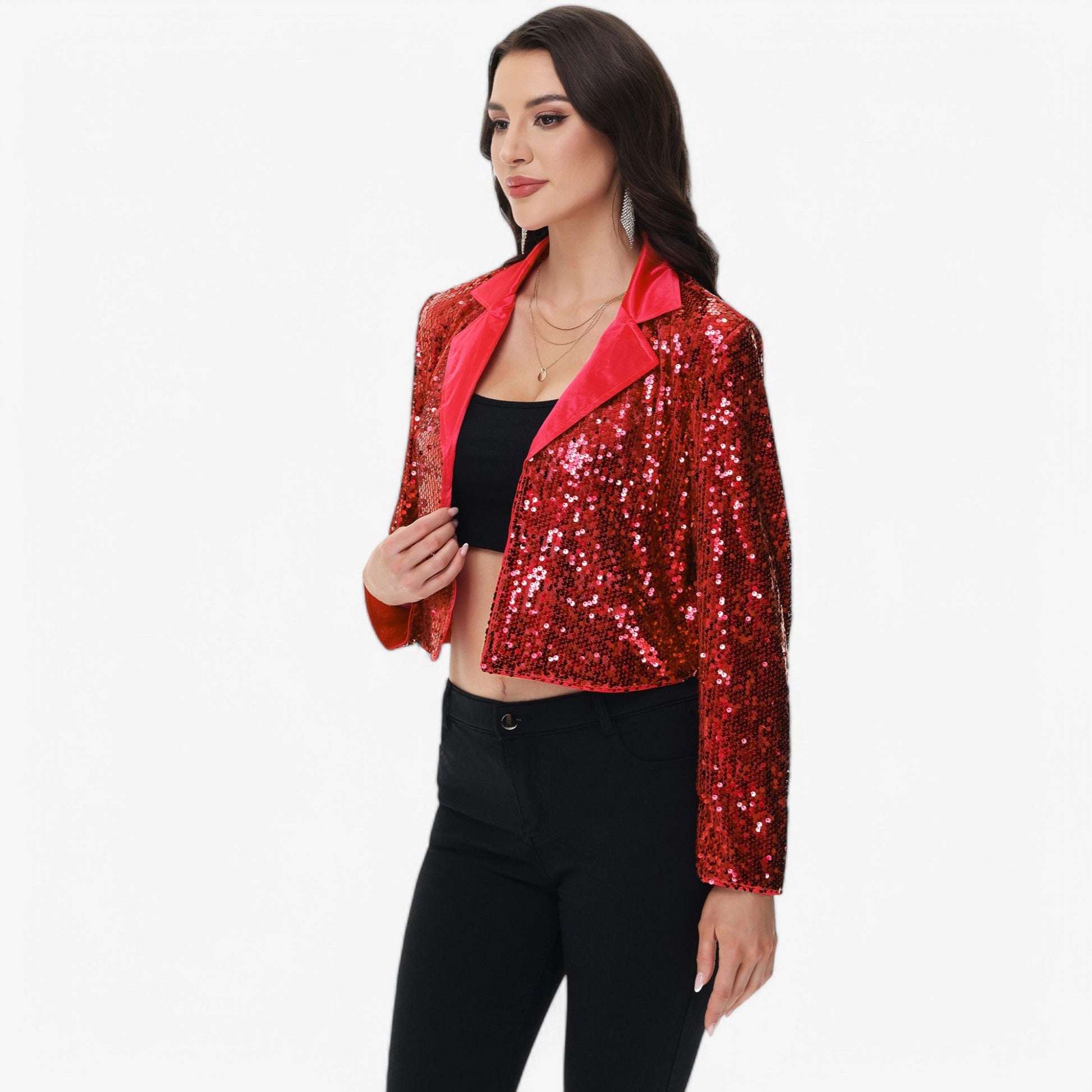 The Anna-Kaci Women's Sequin Cropped Blazer adds a bold statement to any outfit. Covered in shimmering sequins, this cropped blazer features a sleek open-front design with a contrasting lapel for a sophisticated touch. The long sleeves and structured fit create a polished yet trendy silhouette. Perfect for layering over dresses, bodysuits, or tops, this eye-catching jacket is ideal for parties, club nights, and festive celebrations.