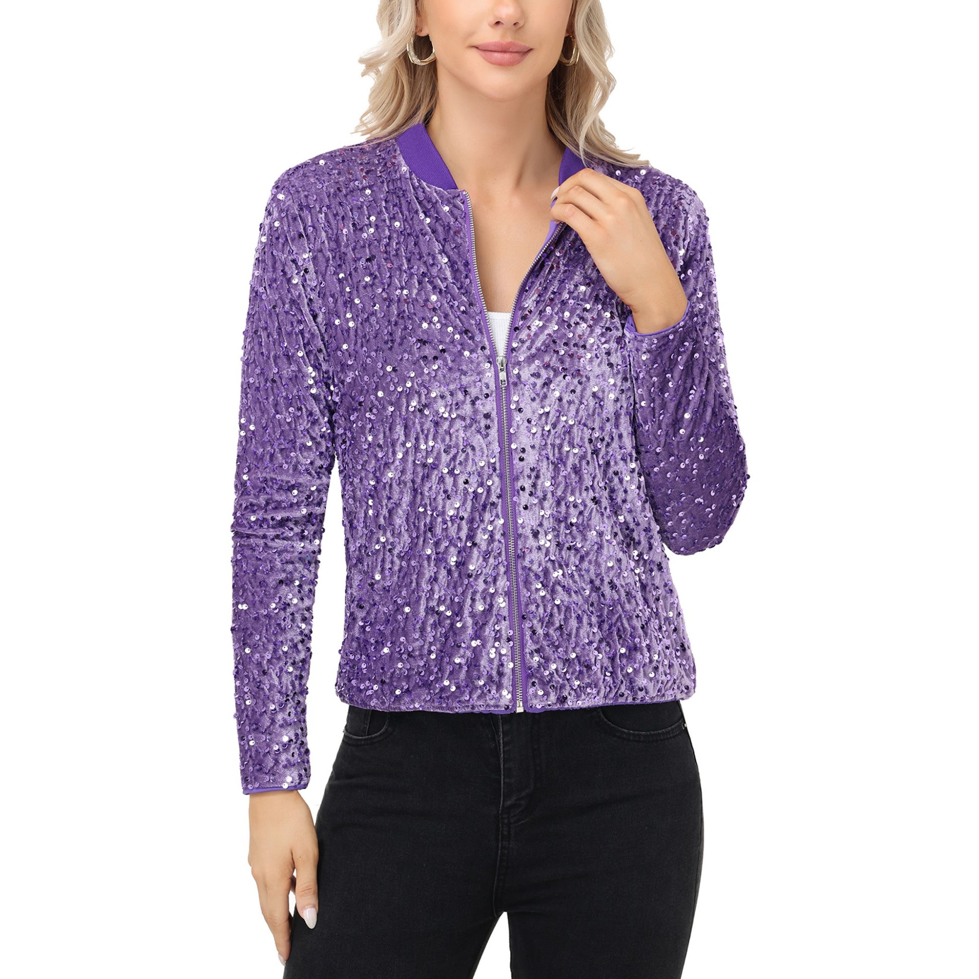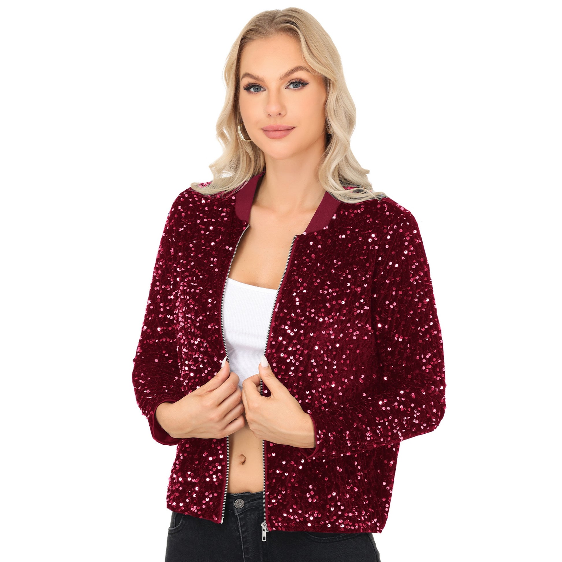 The Anna-Kaci Women's Sequin Bomber Jacket with Front Zipper Closure and Ribbed Trim brings a glamorous edge to any outfit. Fully embellished with shimmering sequins, this jacket features a sleek bomber-style fit with a zip-up front for easy wear. The soft ribbed collar, cuffs, and hem provide comfort and structure, while the sparkling surface catches the light beautifully. Perfect for adding a bold statement to casual or evening looks.
