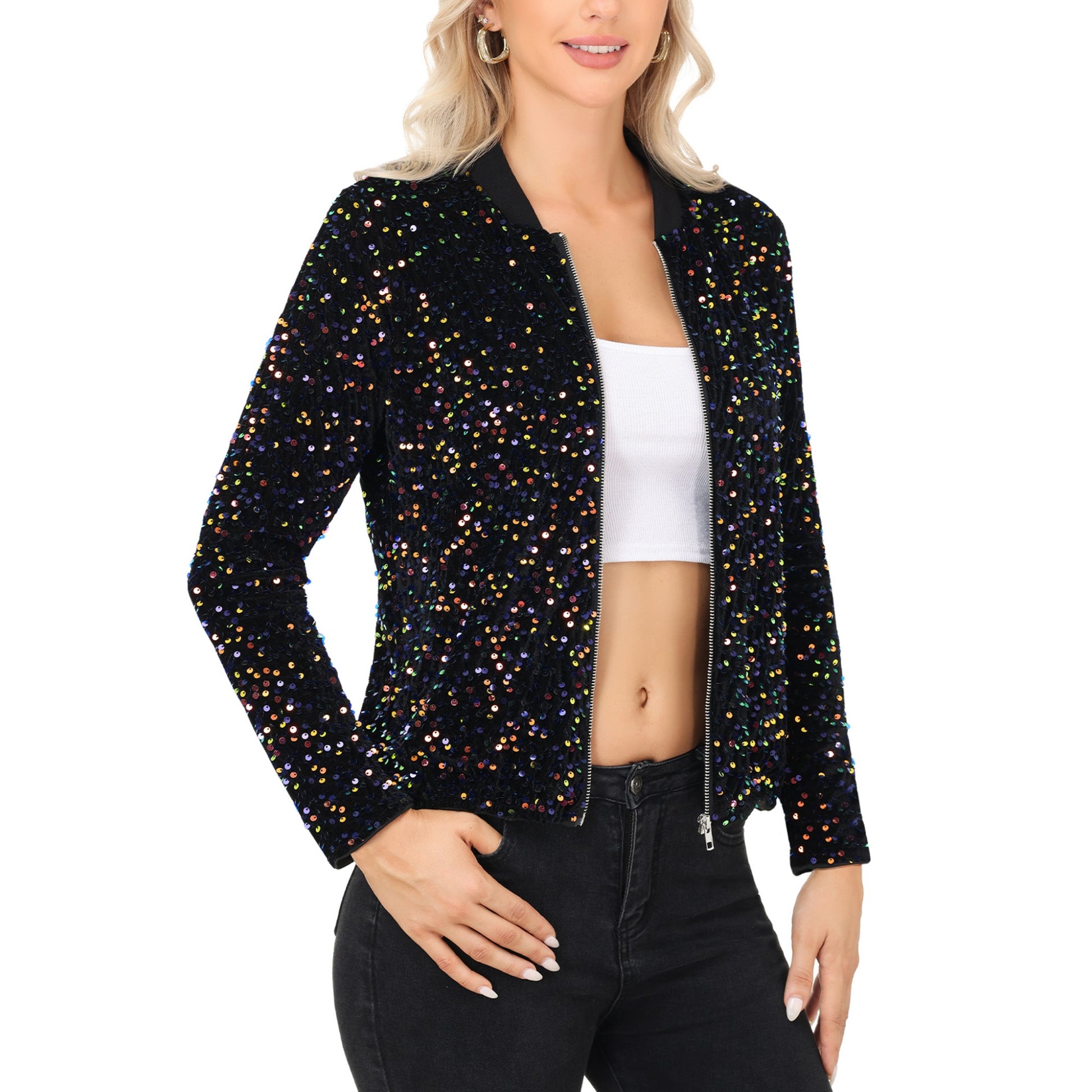 Sequin Bomber Jacket with Front Zipper Closure and Ribbed Trim