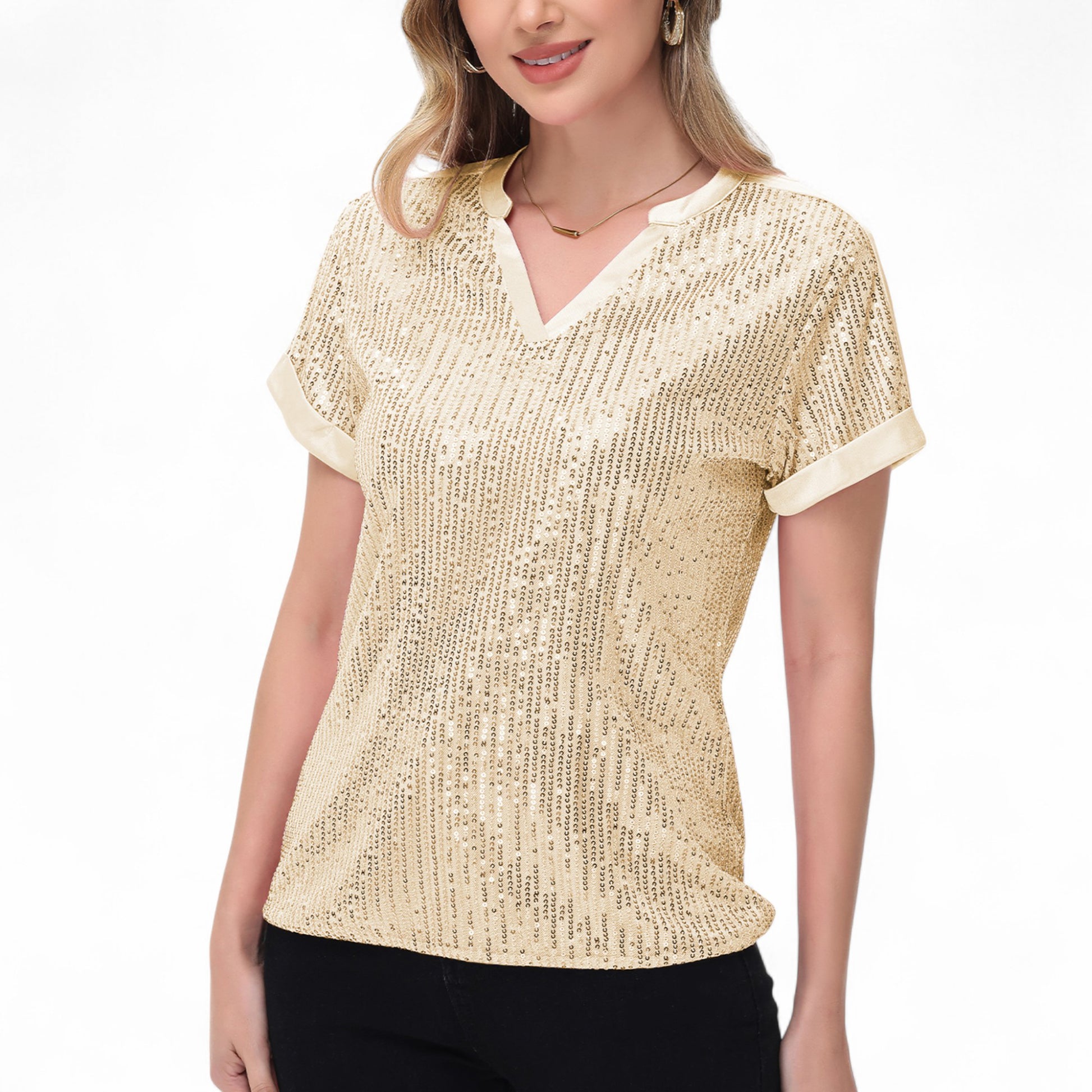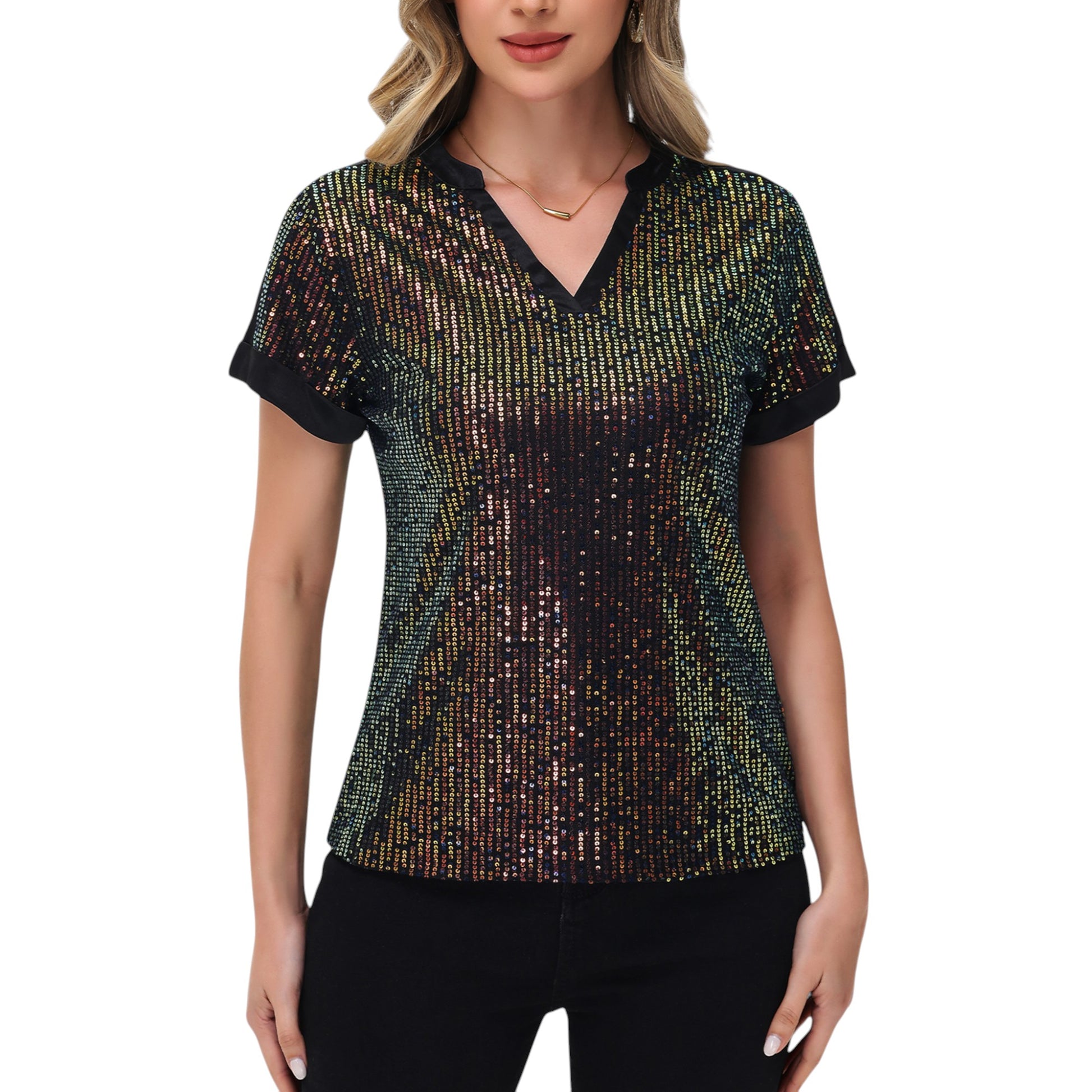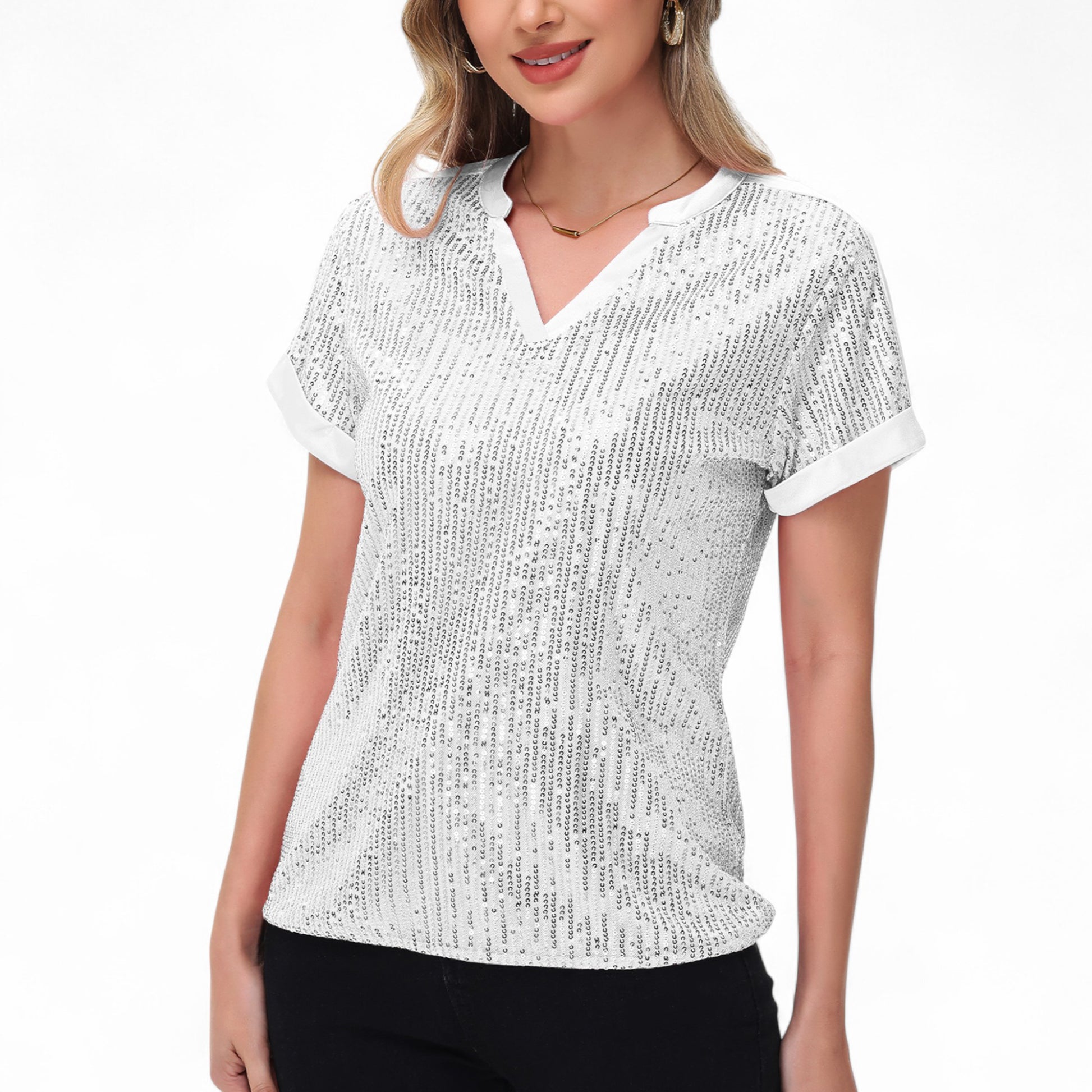 This women's sequin short sleeve top blends everyday elegance with festive sparkle. Designed with an eye-catching sequin front, it features a flattering V-neckline trimmed in satin for a smooth, refined touch. The rolled cuffs add a relaxed yet polished detail, making it perfect for casual gatherings or dressier events. Comfortable and stylish, this top pairs effortlessly with jeans or trousers for a radiant look.