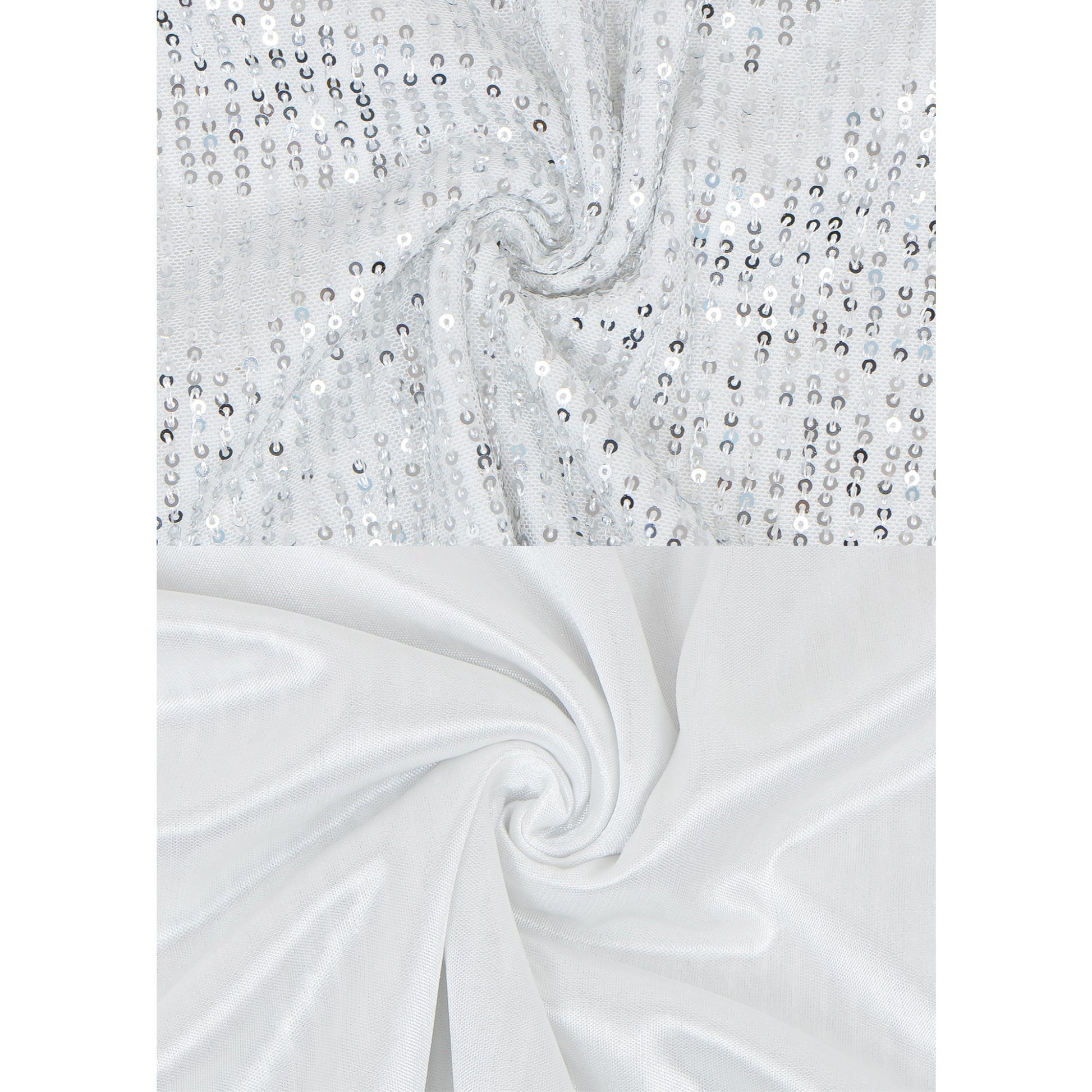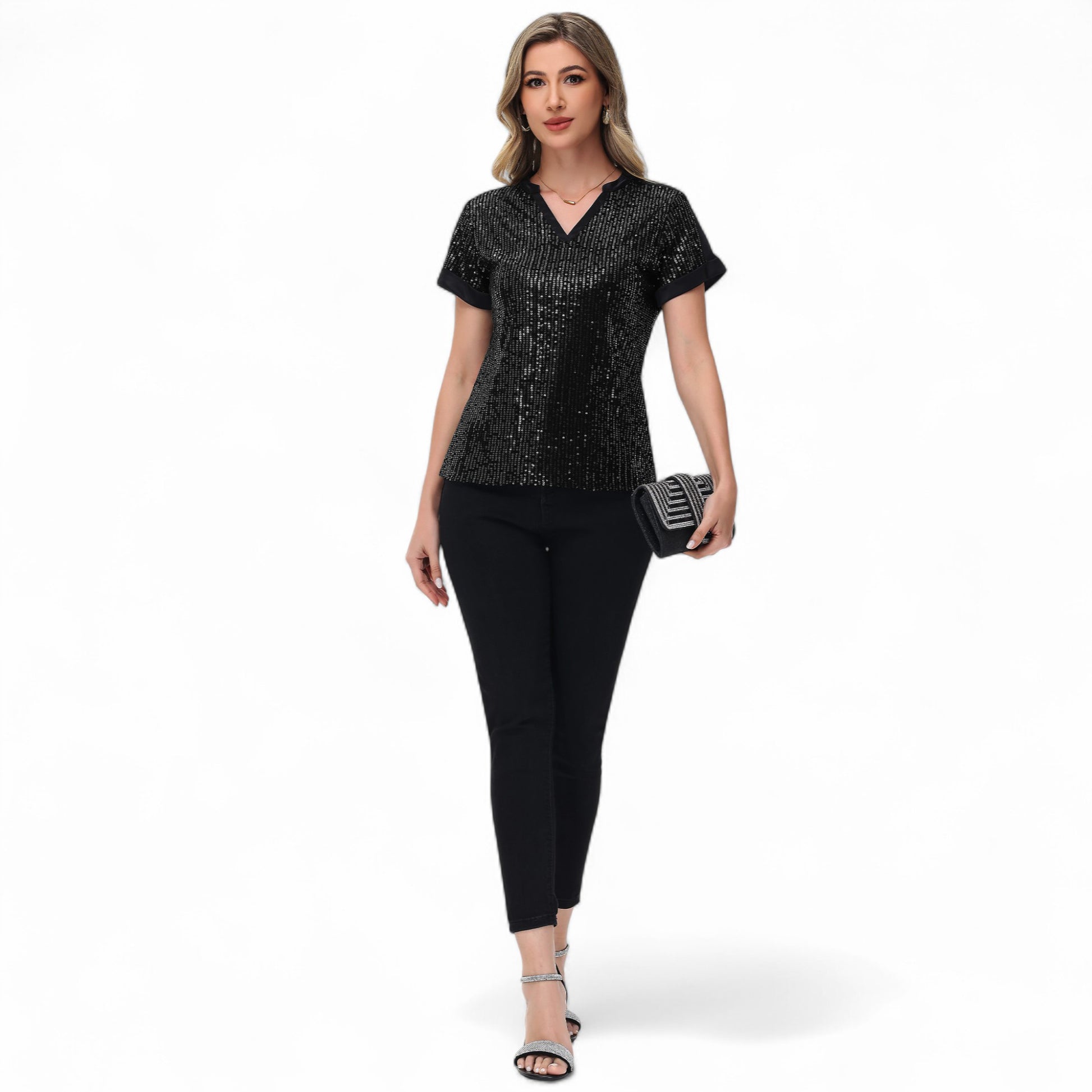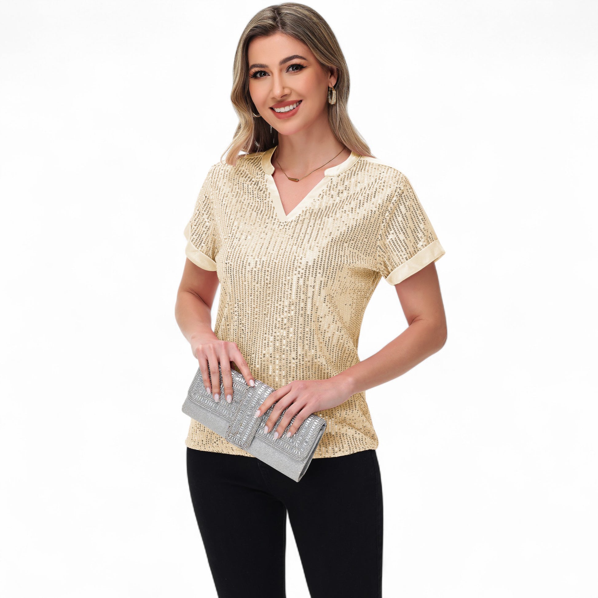 This women's sequin short sleeve top blends everyday elegance with festive sparkle. Designed with an eye-catching sequin front, it features a flattering V-neckline trimmed in satin for a smooth, refined touch. The rolled cuffs add a relaxed yet polished detail, making it perfect for casual gatherings or dressier events. Comfortable and stylish, this top pairs effortlessly with jeans or trousers for a radiant look.