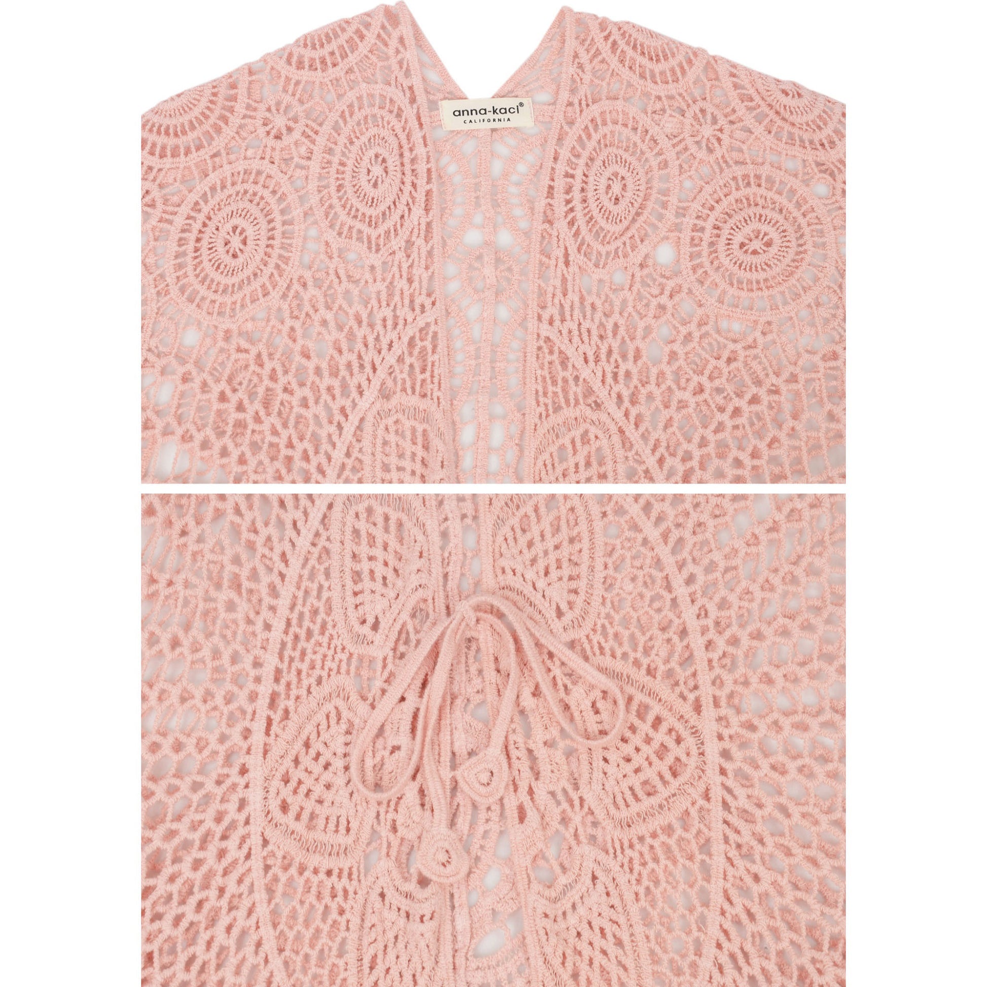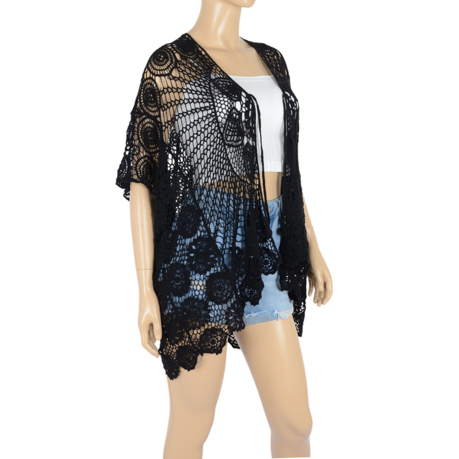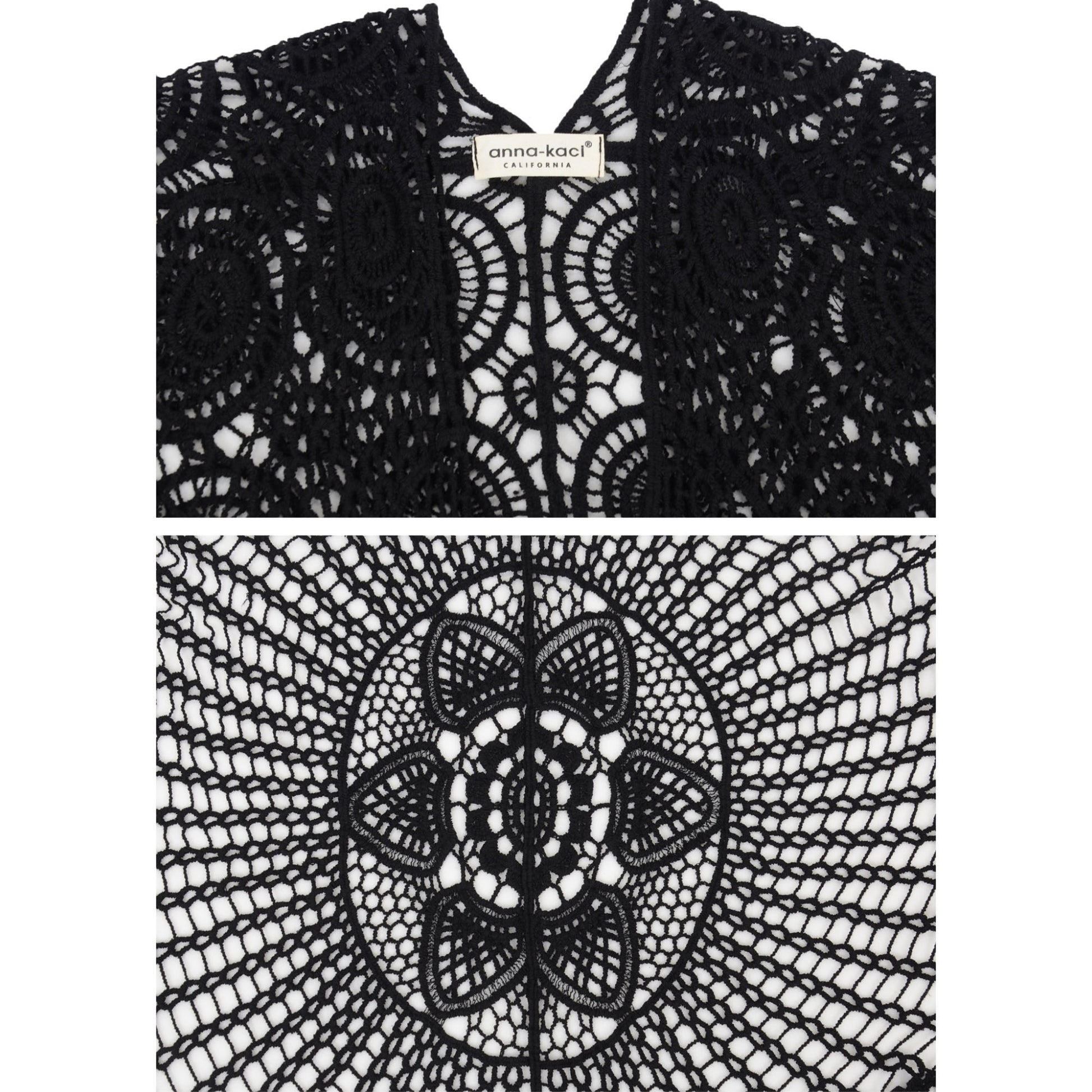 The Anna-Kaci Women's Crochet Cover-Up adds a feminine and breezy touch to your wardrobe. Featuring intricate floral crochet patterns, an open front with a self-tie closure, and short sleeves, this piece blends effortless style with airy comfort. The scalloped hemline enhances its delicate look, making it a versatile layer for casual outfits or beachwear.