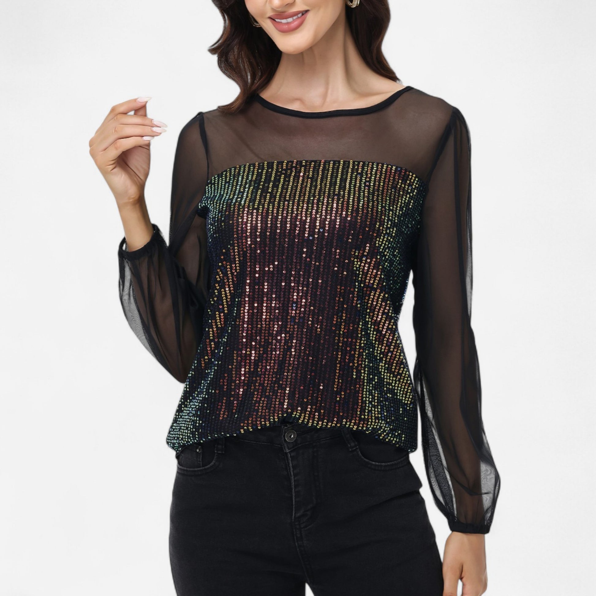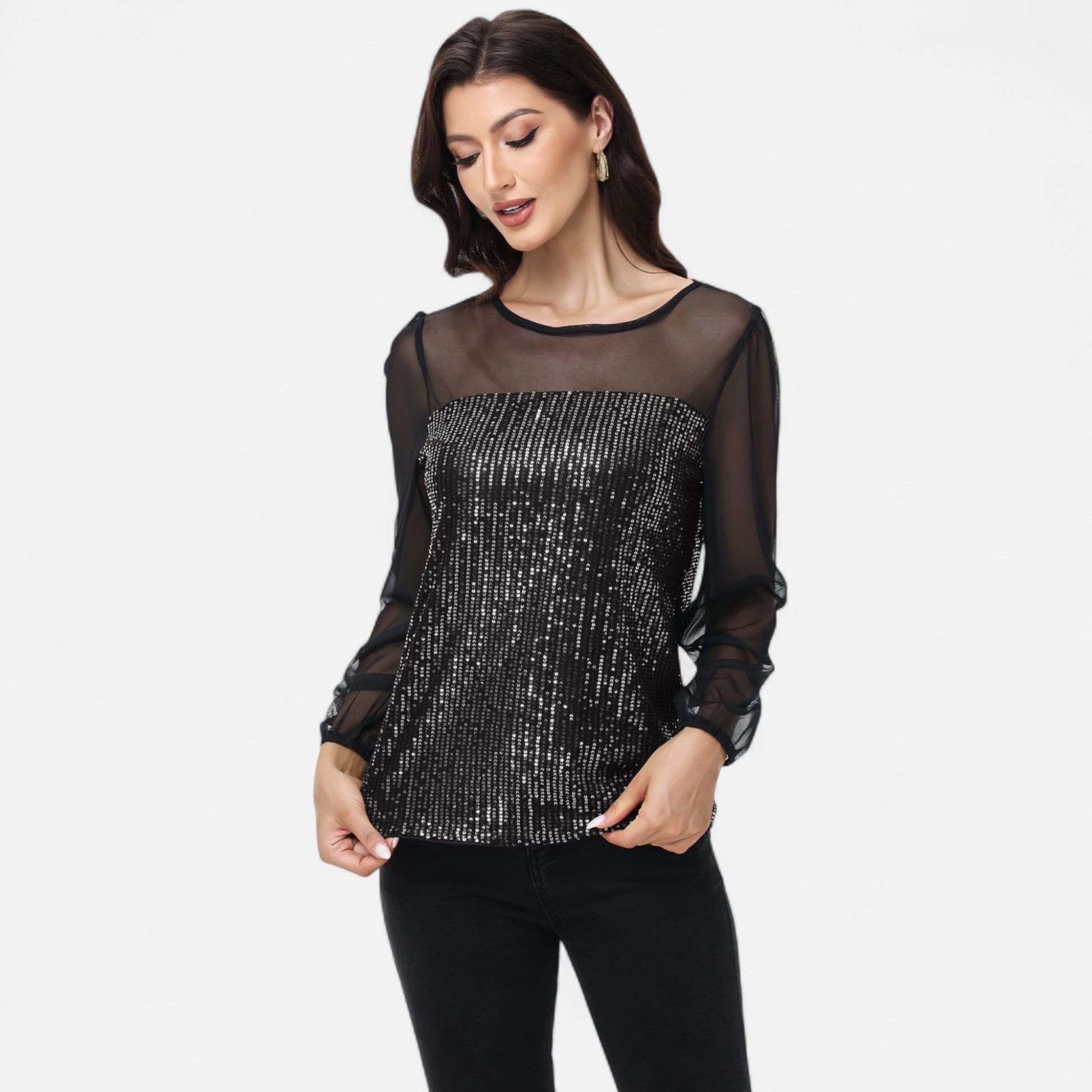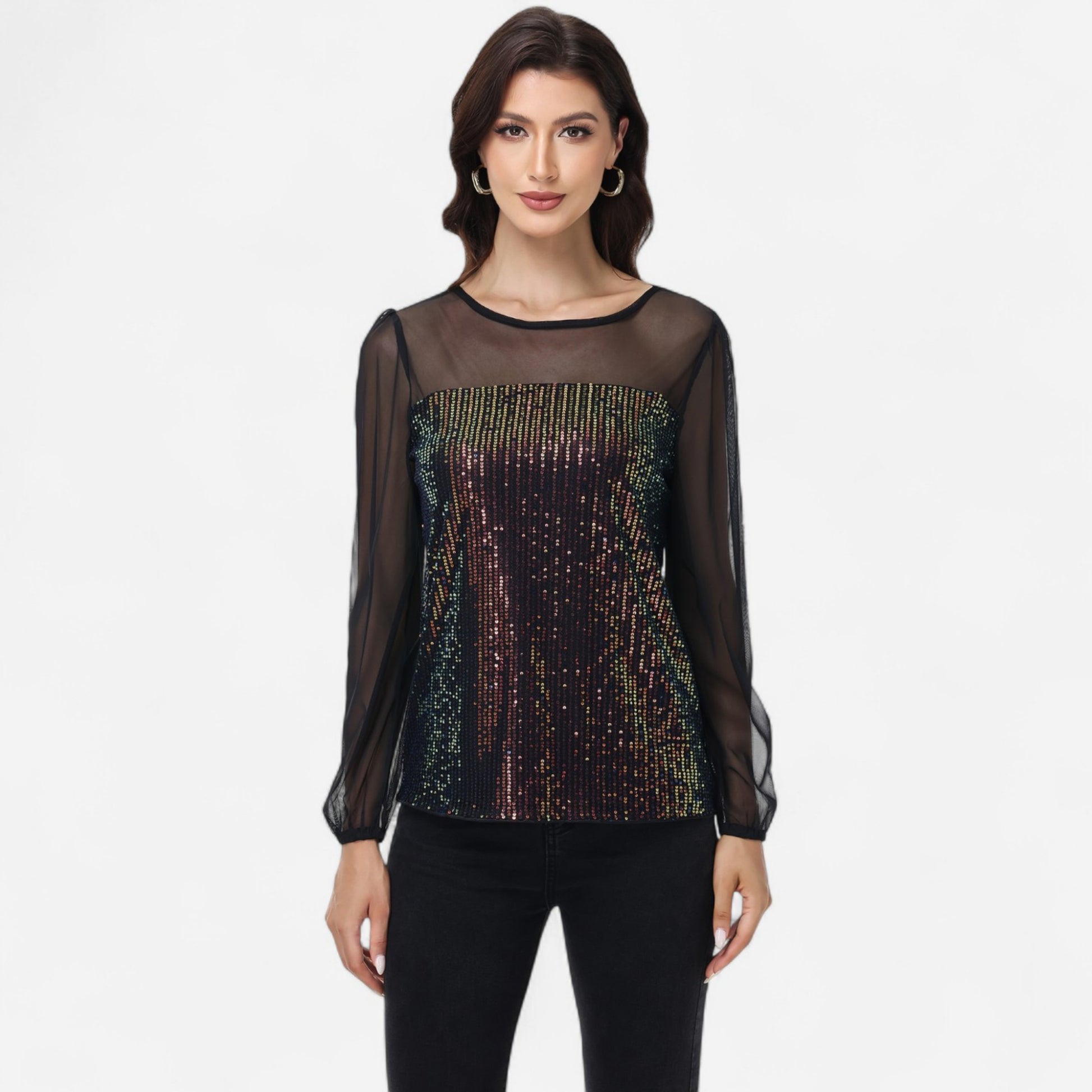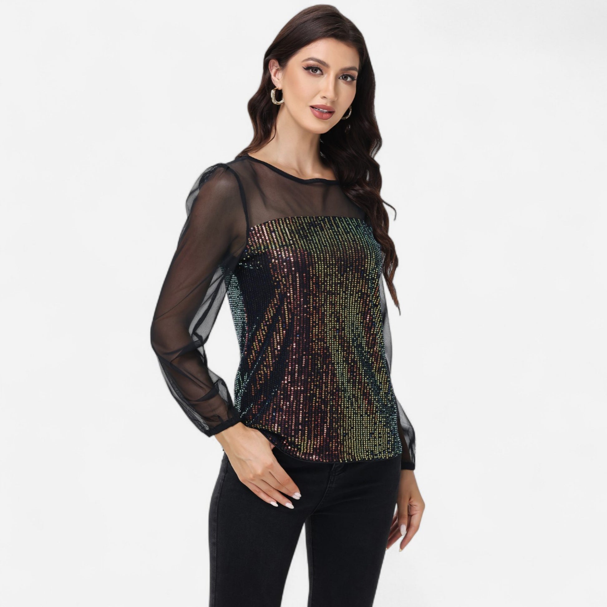This Women's Sheer Mesh Long Sleeve Top features a dazzling sequin front panel paired with lightweight mesh sleeves and a classic crew neckline. Designed for an elegant yet edgy look, this top offers a flattering silhouette that effortlessly elevates your style. Ideal for pairing with jeans or dress pants for a chic evening outfit.