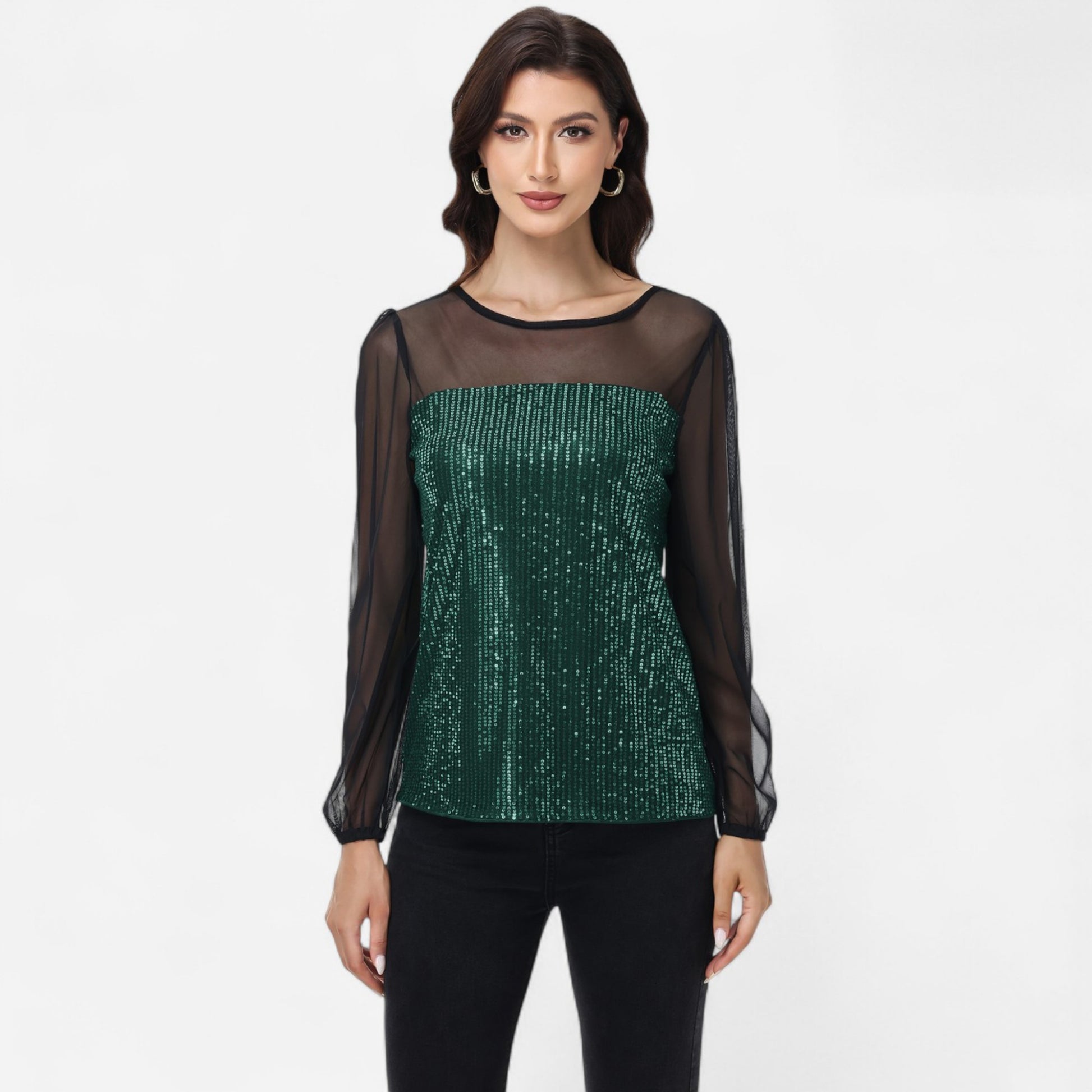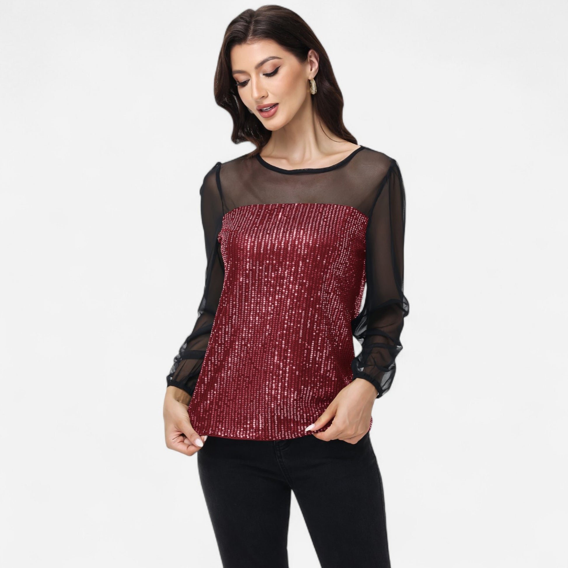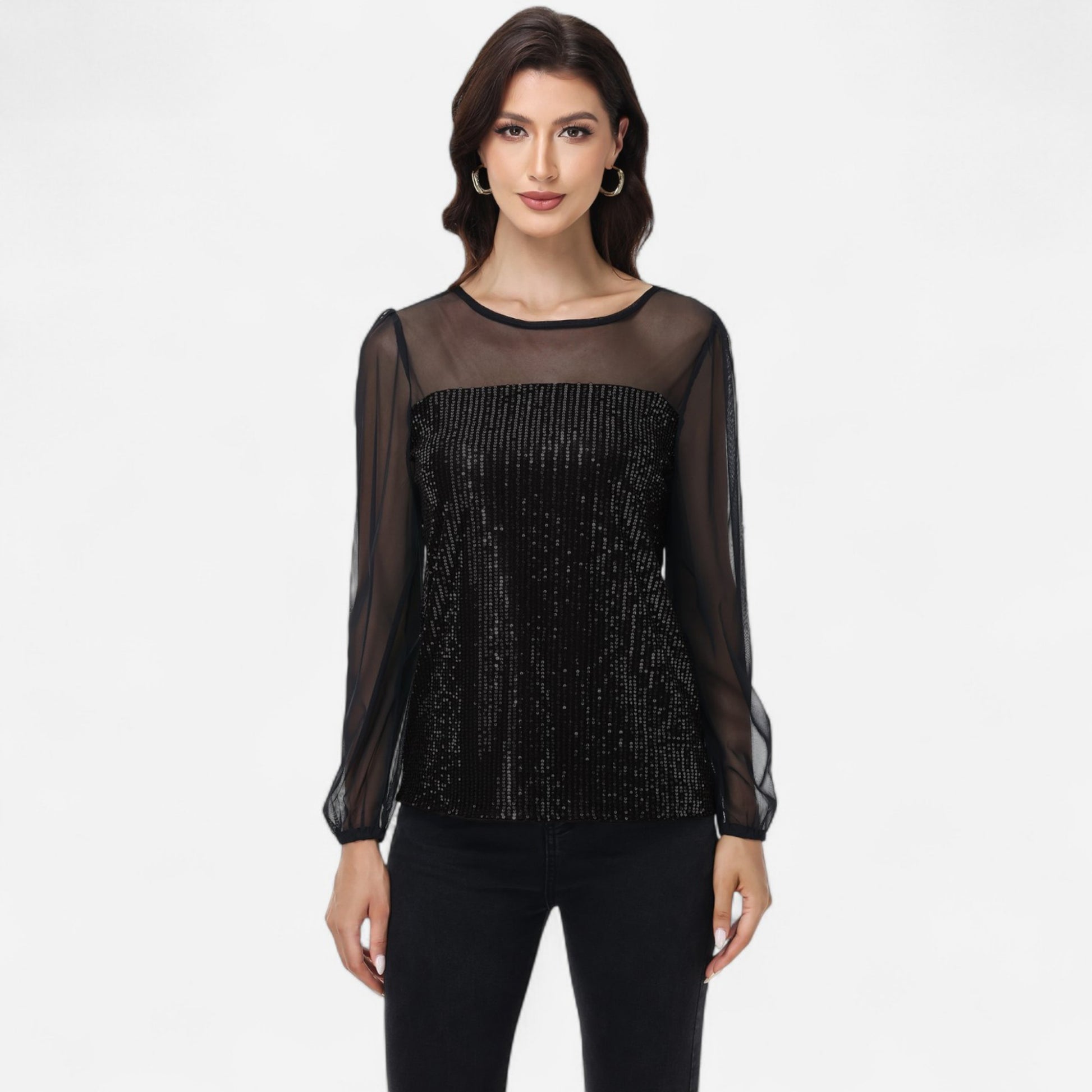 This Women's Sheer Mesh Long Sleeve Top features a dazzling sequin front panel paired with lightweight mesh sleeves and a classic crew neckline. Designed for an elegant yet edgy look, this top offers a flattering silhouette that effortlessly elevates your style. Ideal for pairing with jeans or dress pants for a chic evening outfit.