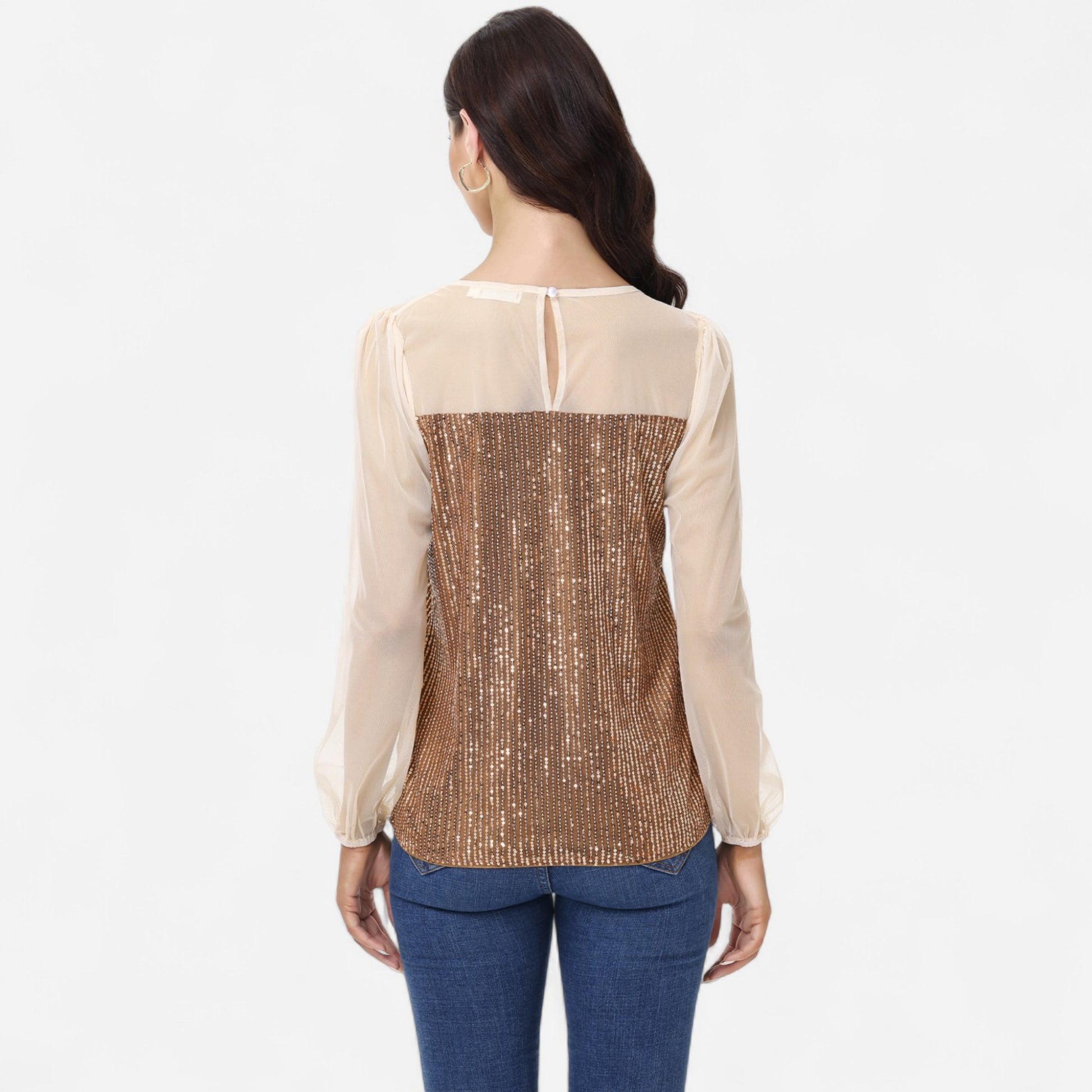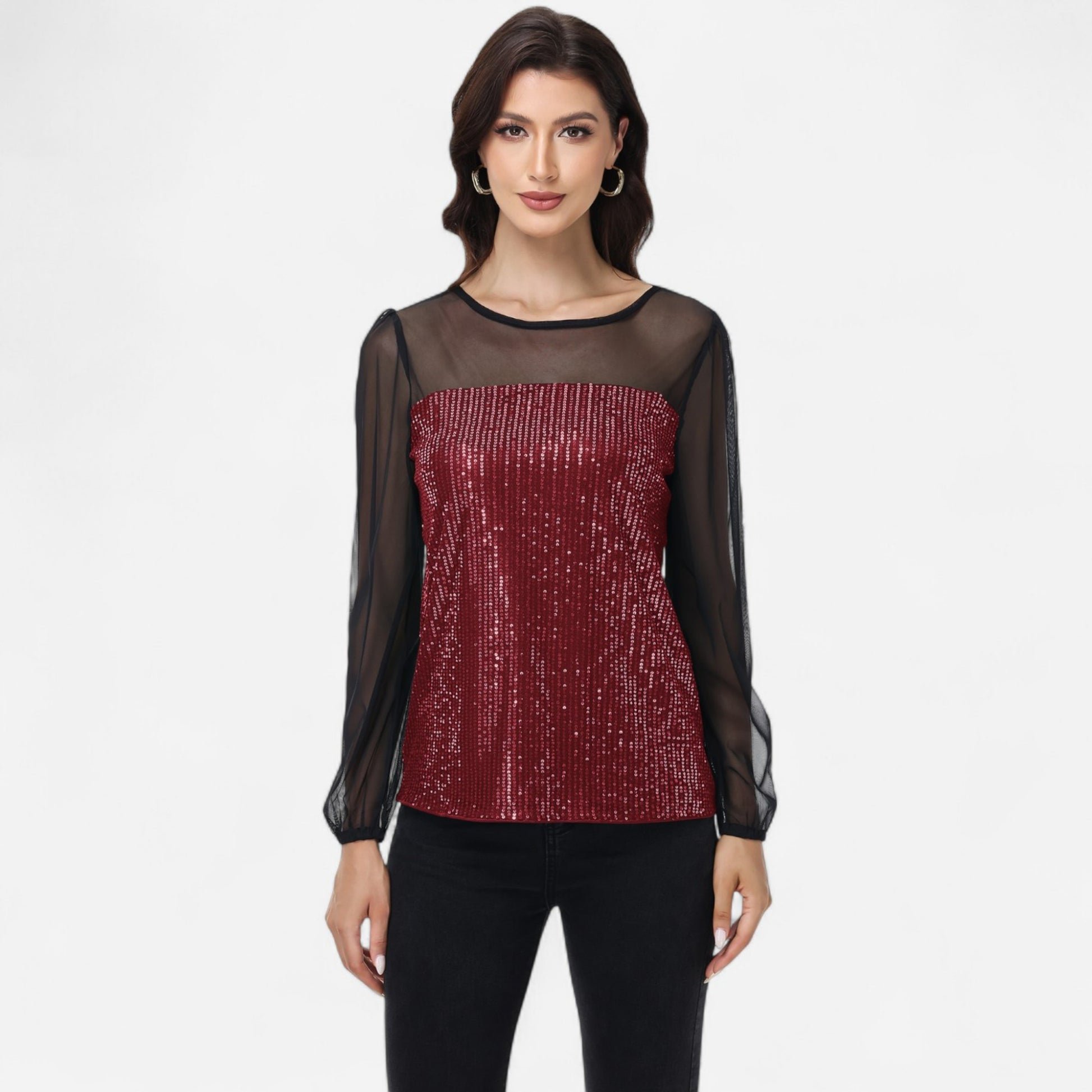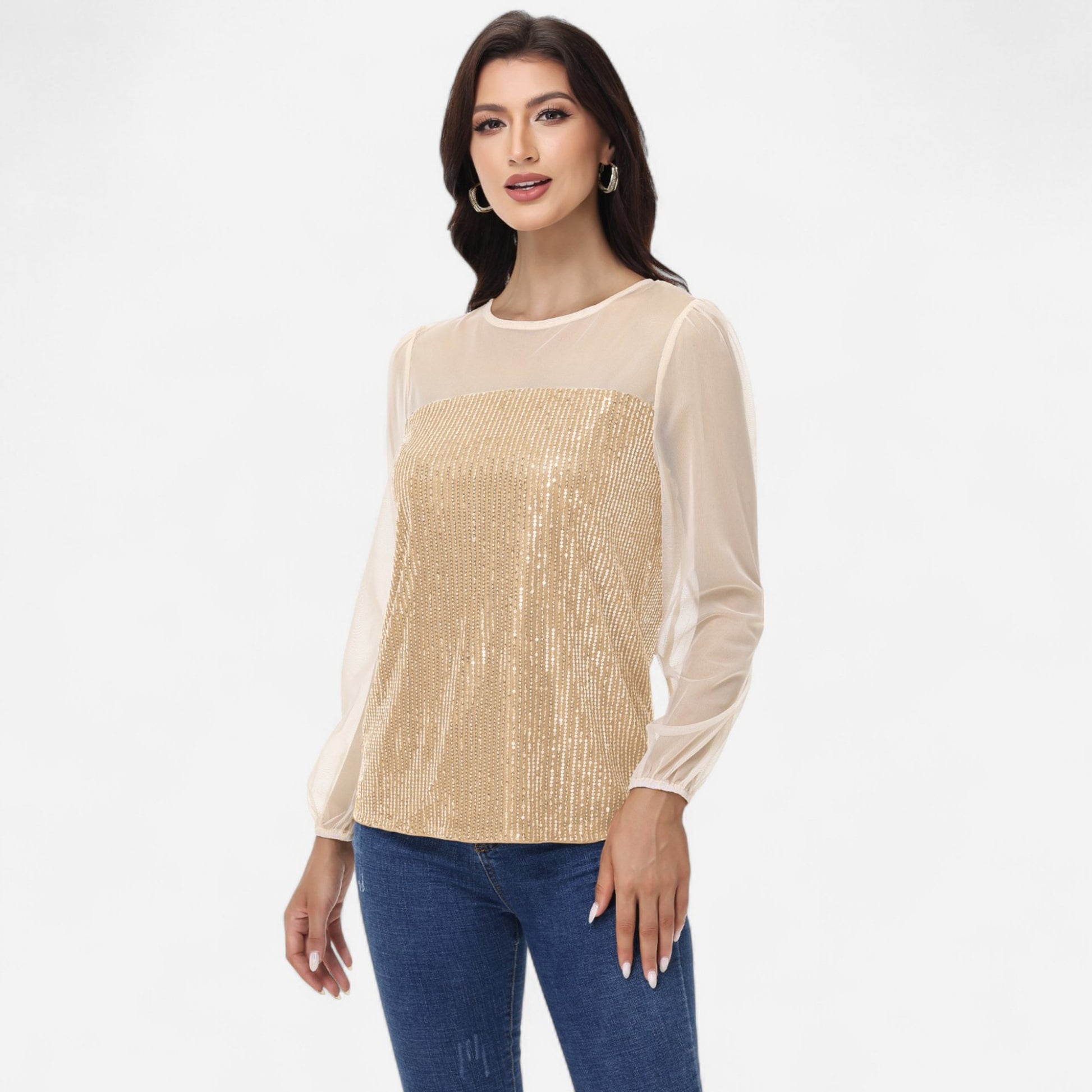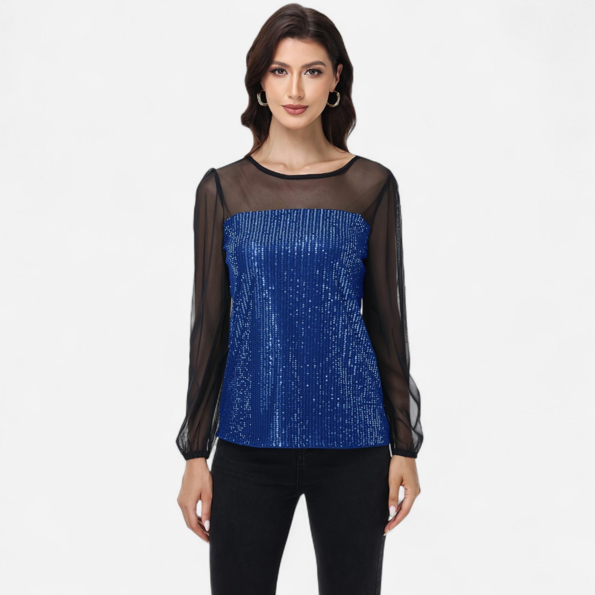 This Women's Sheer Mesh Long Sleeve Top features a dazzling sequin front panel paired with lightweight mesh sleeves and a classic crew neckline. Designed for an elegant yet edgy look, this top offers a flattering silhouette that effortlessly elevates your style. Ideal for pairing with jeans or dress pants for a chic evening outfit.